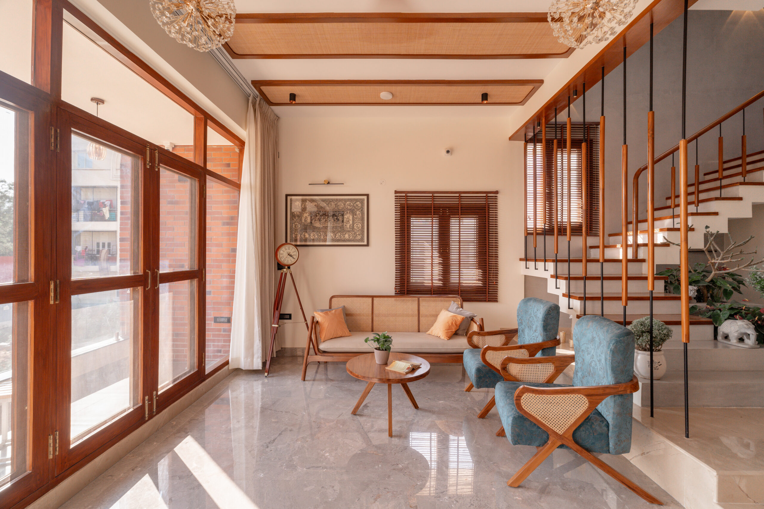 Set on a 30x55 ft plot, this thoughtfully designed home strikes a balance between modern living and Indian sensibilities. The layout brings nature into everyday life, with a serene indoor garden placed beside the dining area—creating a peaceful, light-filled space for family gatherings. Above the car park, a mezzanine-level living room offers a sense of privacy while providing elevated views of the surroundings. One of the home’s unique features is the rooftop garden above the entry ramp—a quiet green corner that transforms a functional space into a refreshing retreat. The exterior embraces a clean, minimalist style, subtly enriched with Indian elements that give it cultural depth. Vertical slatted screens on the facade not only provide privacy but also play with light and shadow, adding texture and warmth to the overall look. Designed to feel both open and private, the home reflects the client’s desire for a space that’s modern, functional, and in harmony with nature and tradition.