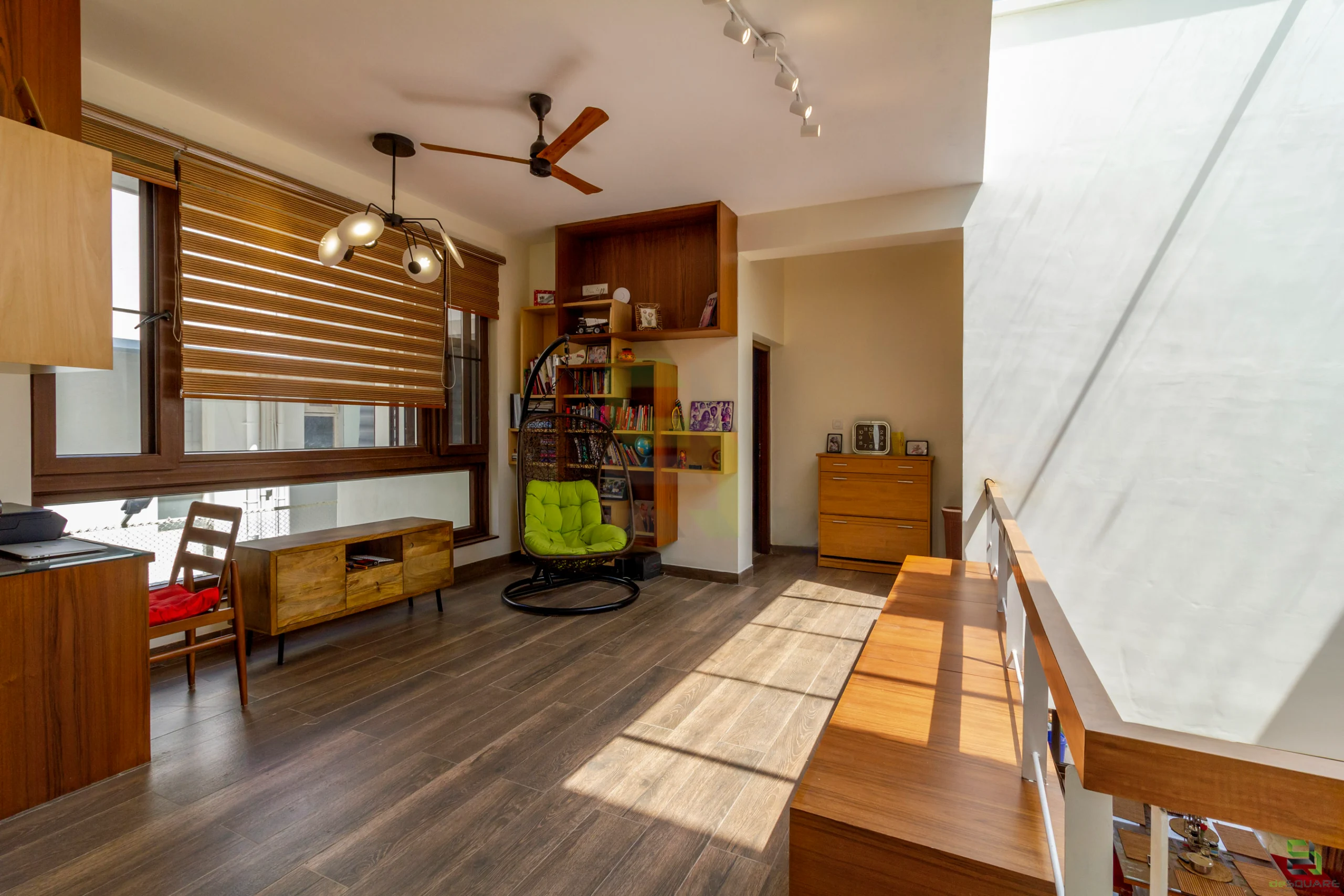 The client had given a free hand in designing this project on a site of 40x70 in East Bangalore. Their main emphasis was on natural light and ventilation and a lot of space for garden. They wanted a lot of vibrance inside, brought in by both the material colours and natural light. The design concept was that of stacked cubes with space in between these cubes becoming skylights and gardens. Even the elevation is very geometrical with cubes protruding from each other. The staircase is given its due importance in the design, as its projected as a central character in the building and its visible from all common spaces. There is a garden visible from every room