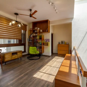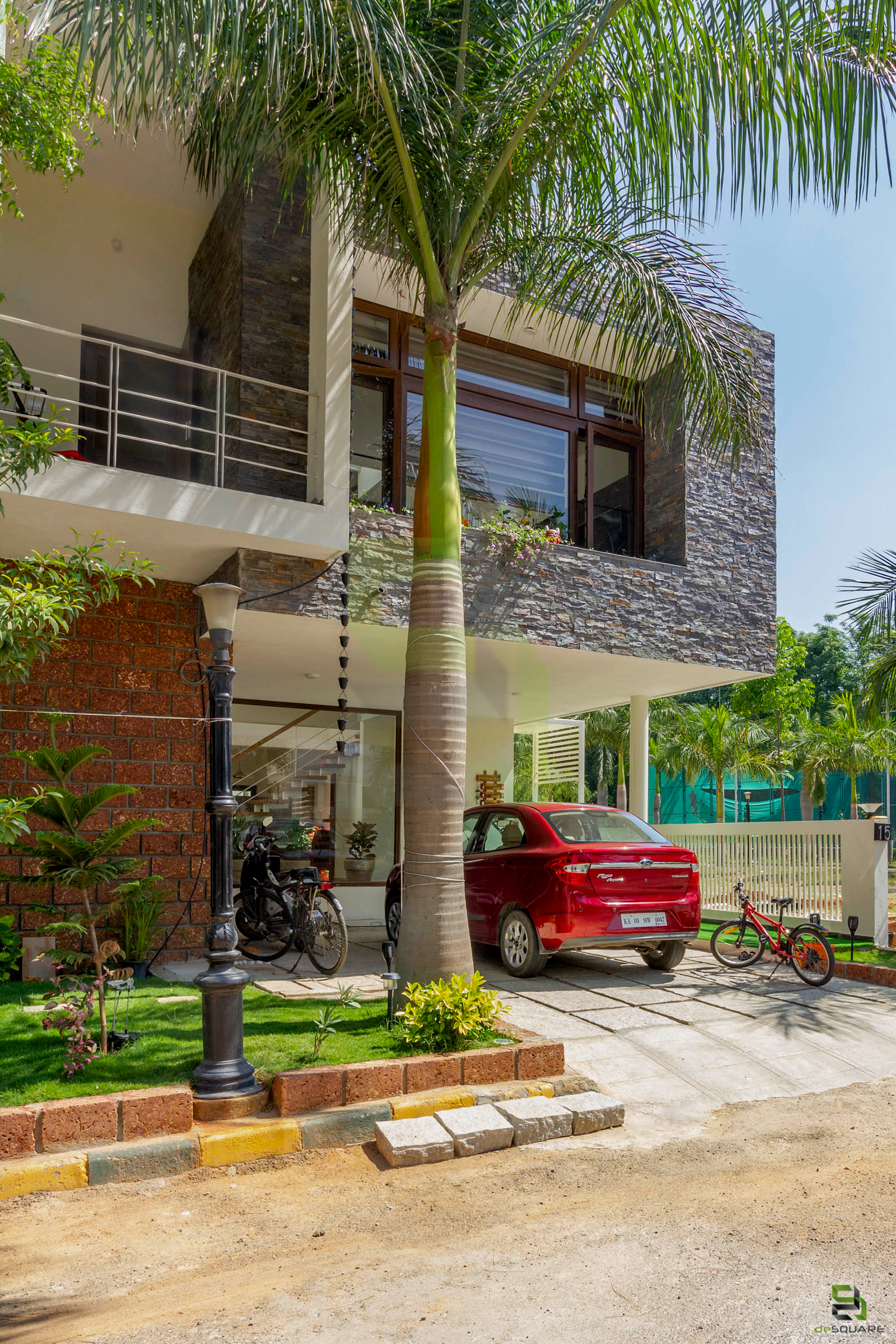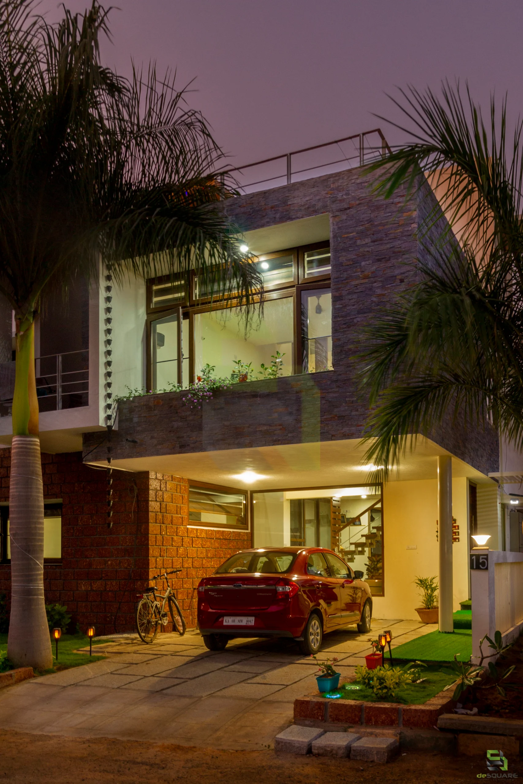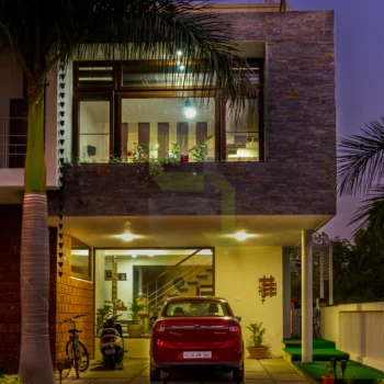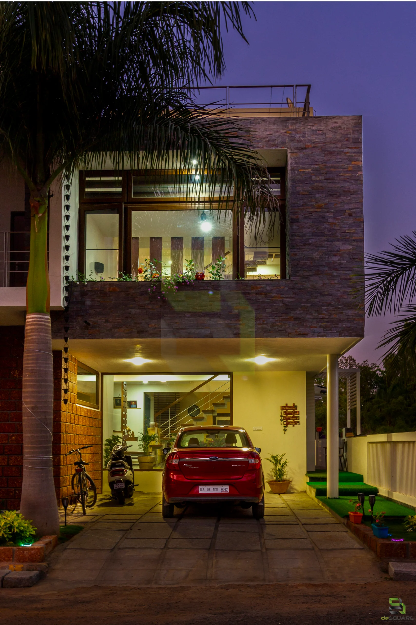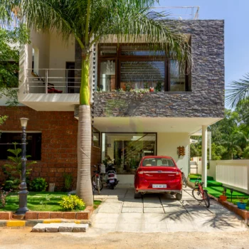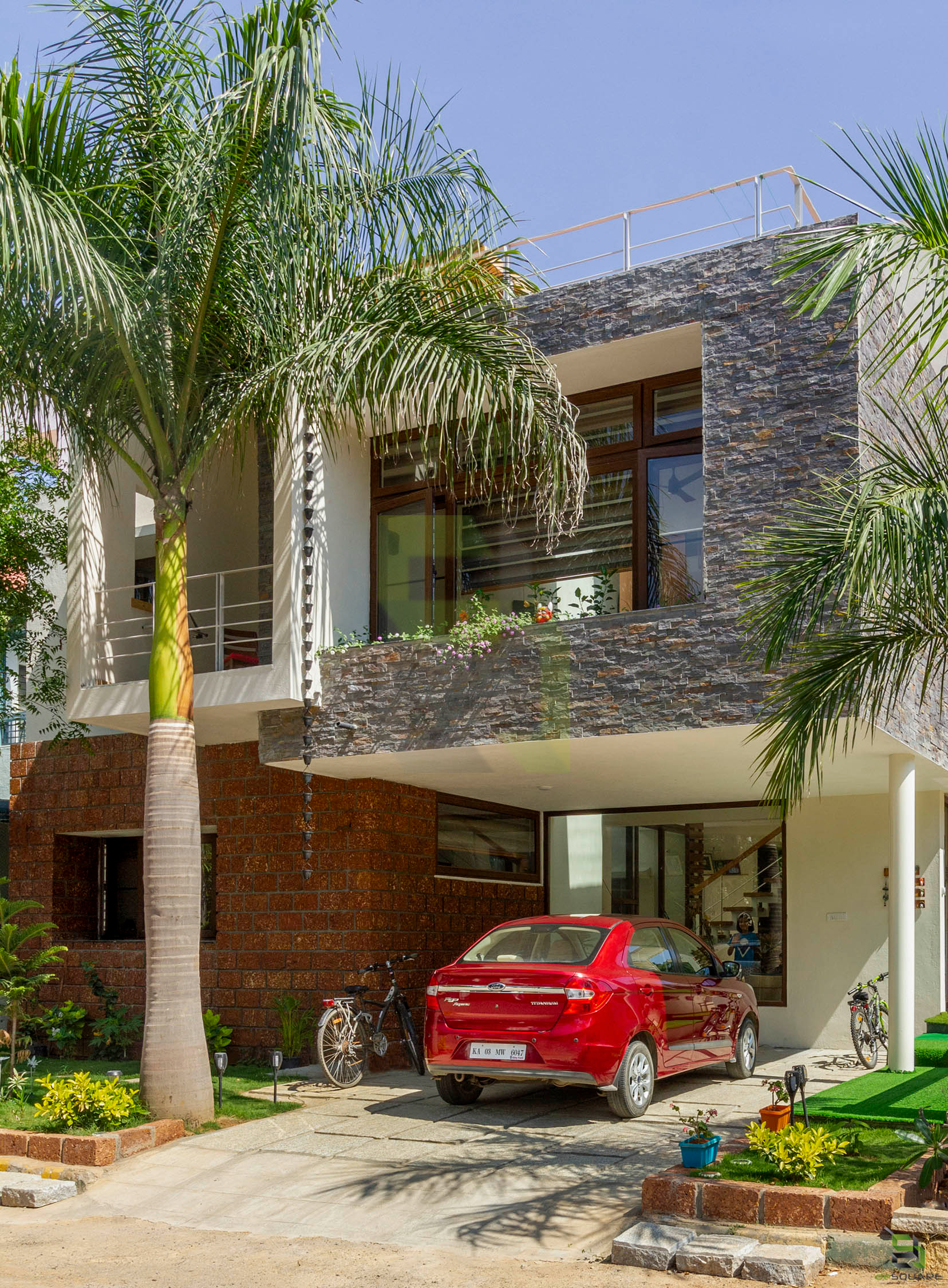 The client had given a free hand in designing this project on a site of 40x70 in East Bangalore. Their main emphasis was on natural light and ventilation and a lot of space for garden. They wanted a lot of vibrance inside, brought in by both the material colours and natural light. The design concept was that of stacked cubes with space in between these cubes becoming skylights and gardens. Even the elevation is very geometrical with cubes protruding from each other. The staircase is given its due importance in the design, as its projected as a central character in the building and its visible from all common spaces. There is a garden visible from every room