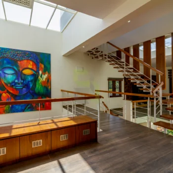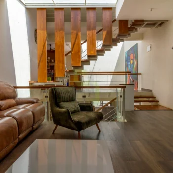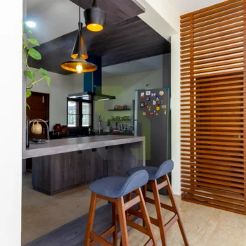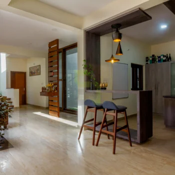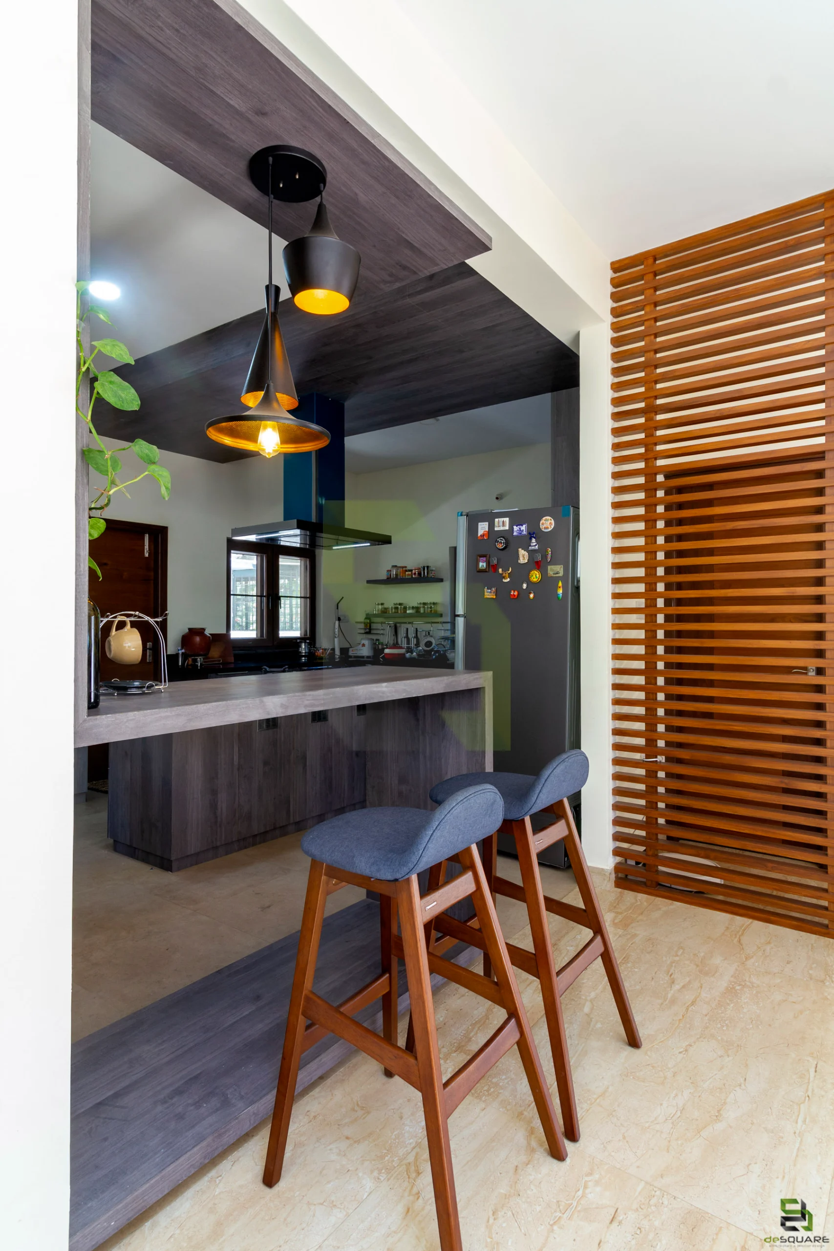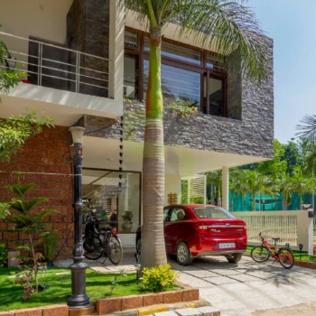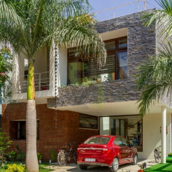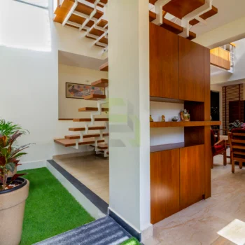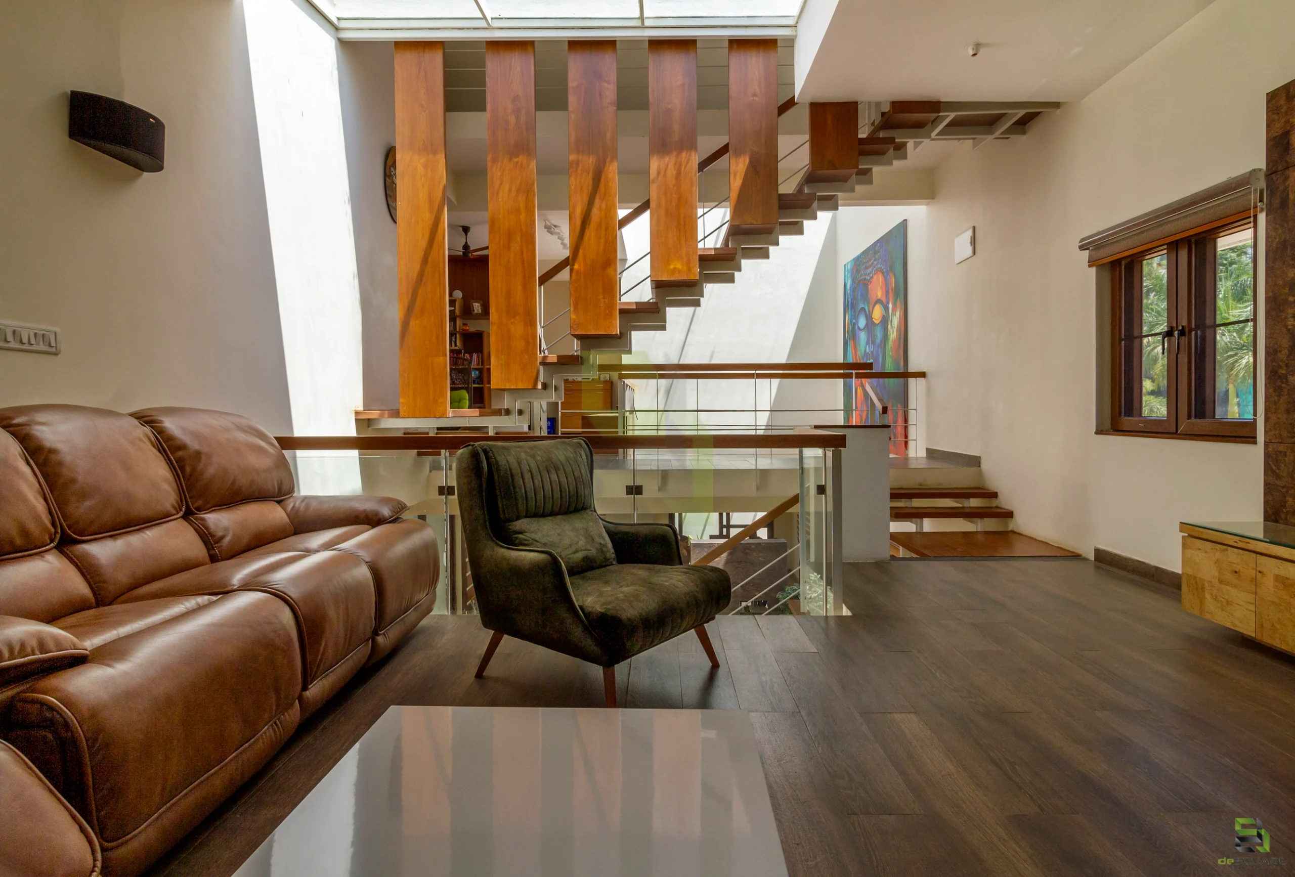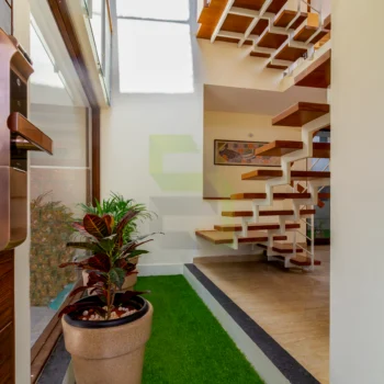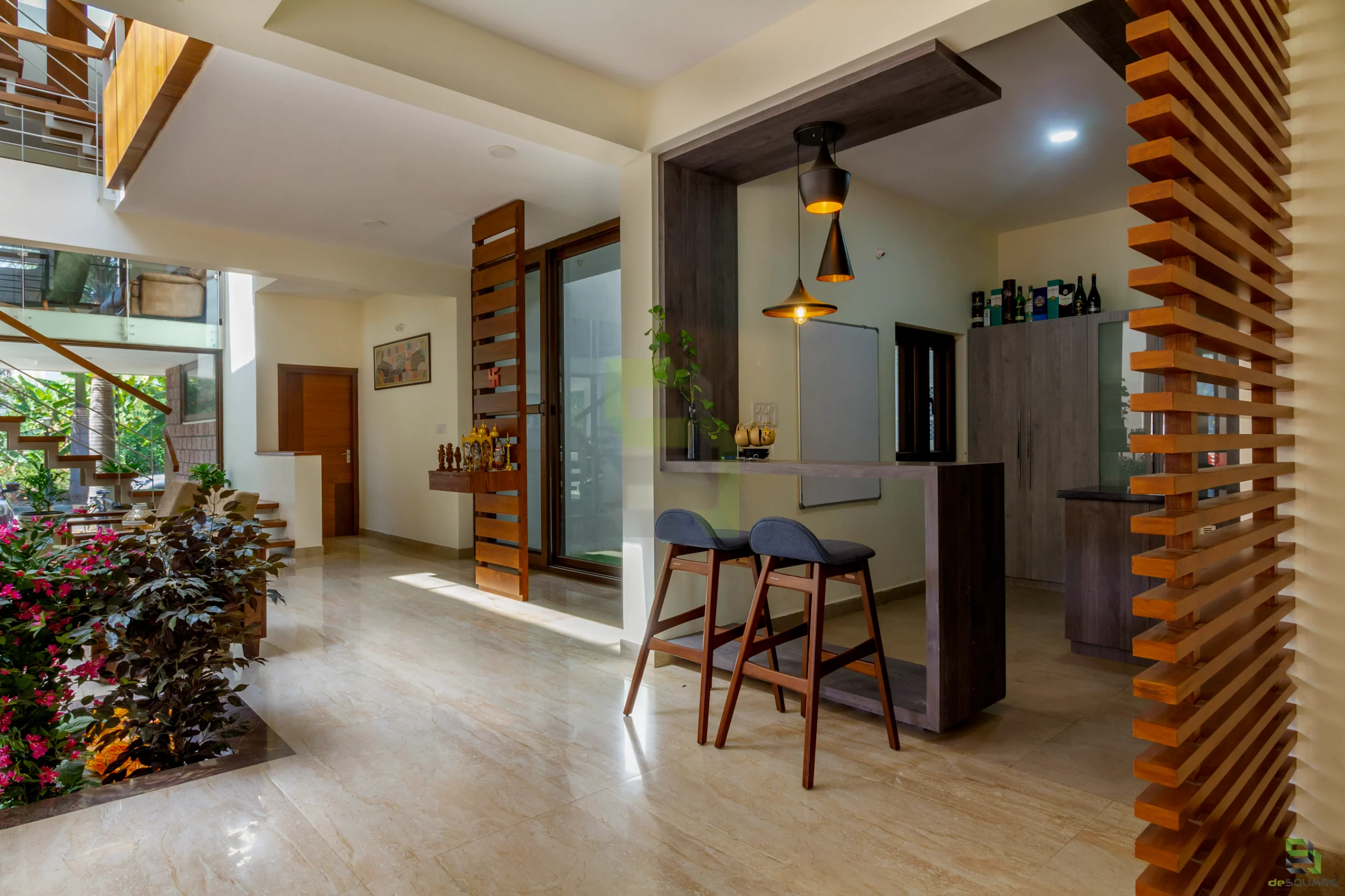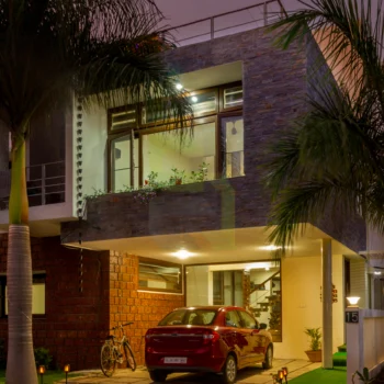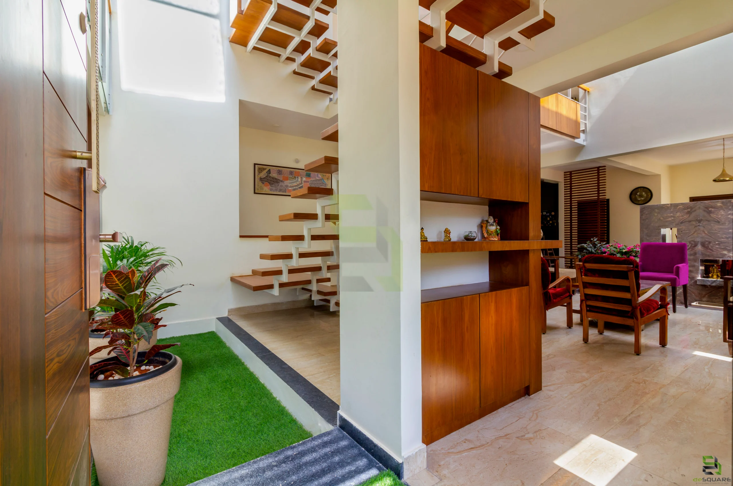 The client had given a free hand in designing this project on a site of 40x70 in East Bangalore. Their main emphasis was on natural light and ventilation and a lot of space for garden. They wanted a lot of vibrance inside, brought in by both the material colours and natural light. The design concept was that of stacked cubes with space in between these cubes becoming skylights and gardens. Even the elevation is very geometrical with cubes protruding from each other. The staircase is given its due importance in the design, as its projected as a central character in the building and its visible from all common spaces. There is a garden visible from every room