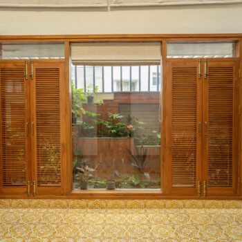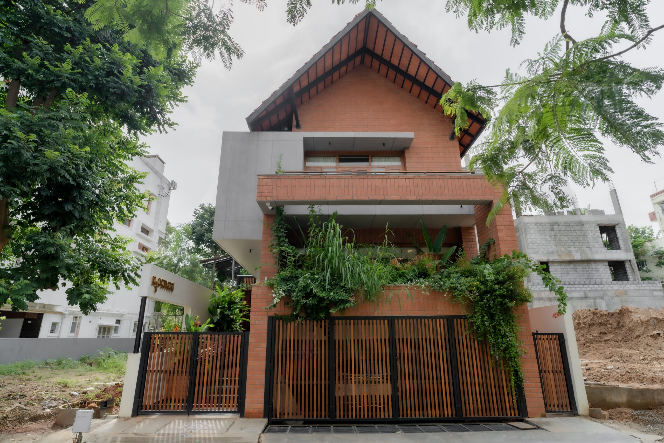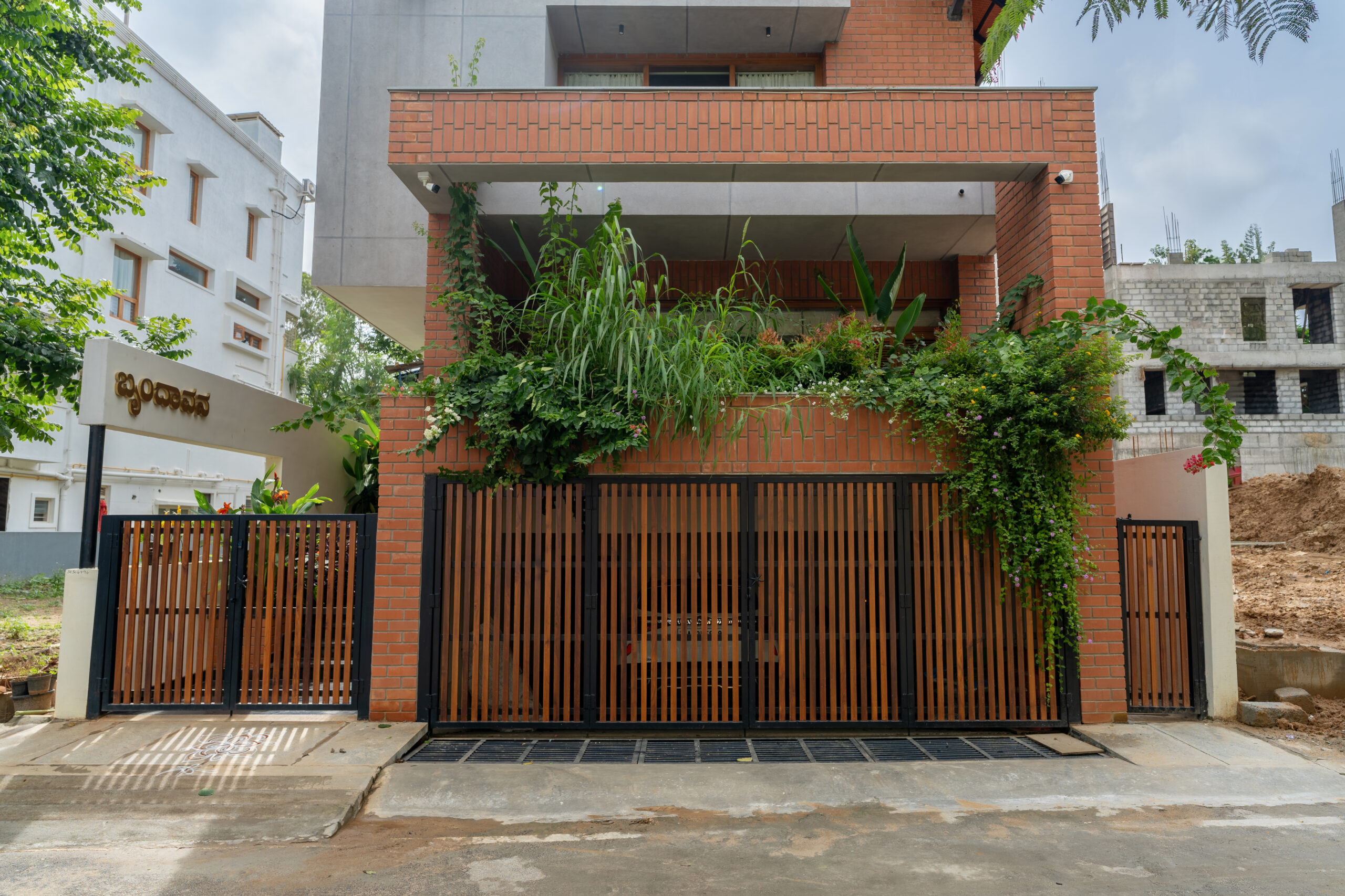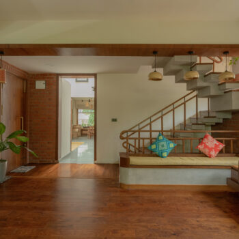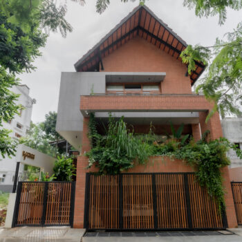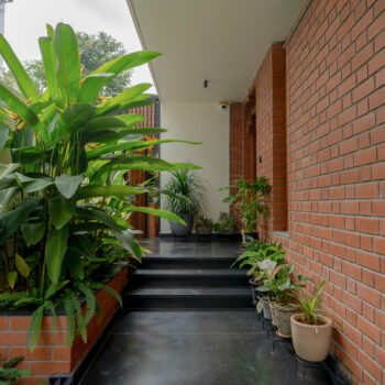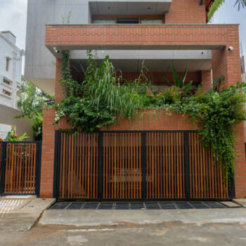 A typical site in the urban context, which is restricted in its size, and hence, limited area for parking and open green spaces. The design approach was to provide a good balance between built and the un-built spaces. This was achieved by making the lowest level partly below and the intermediate level, partly above the road , providing ample space for parking and green spaces. Every level has its own green space, and they spill into each other. The focal point being the garden in level 2,with every space in level 2 and level 3 looking into this garden. Importance was given in using natural materials like the exposed brick work, logs for railing, mud plastering, lime wash etc.