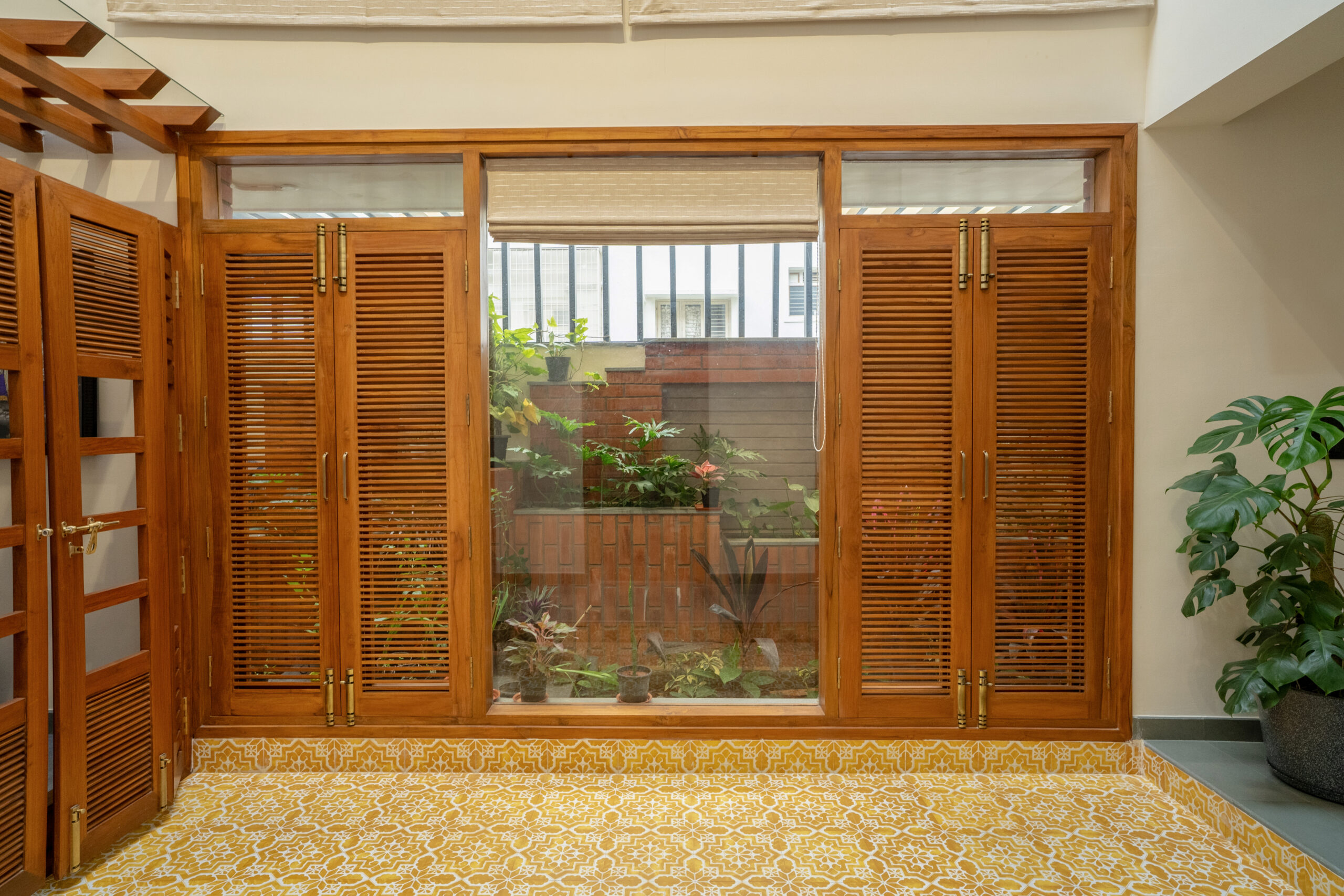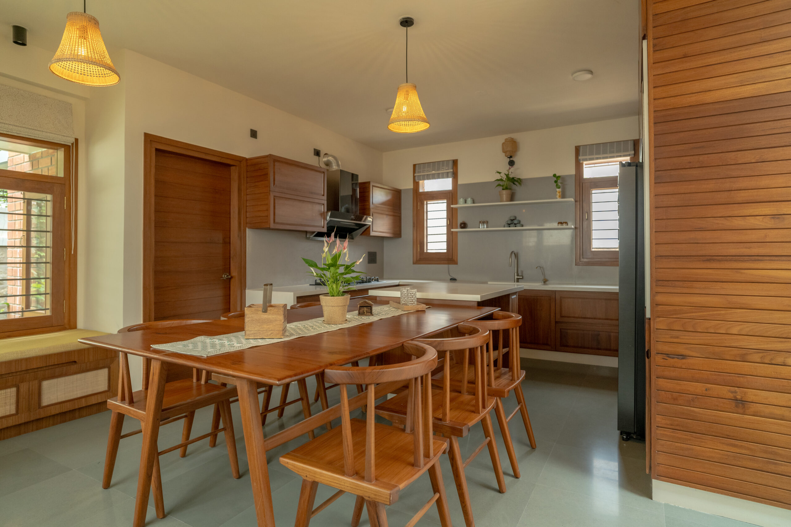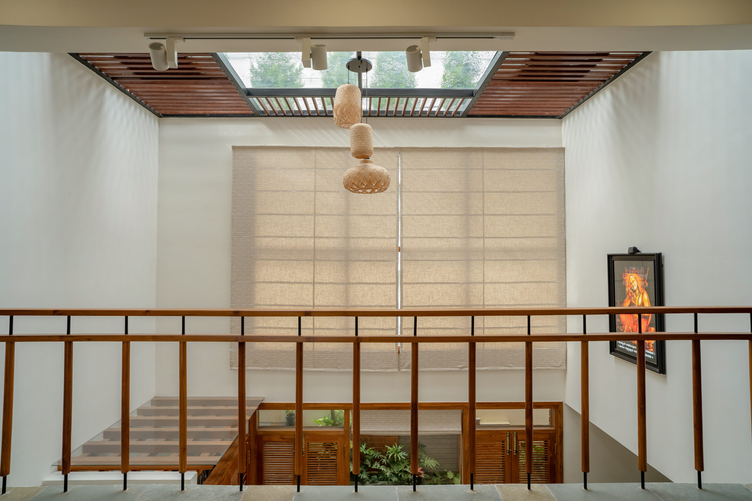A typical site in the urban context, which is restricted in its size, and hence, limited area for parking and open green spaces. The design approach was to provide a good balance between built and the un-built spaces. This was achieved by making the lowest level partly below and the intermediate level, partly above the road , providing ample space for parking and green spaces. Every level has its own green space, and they spill into each other. The focal point being the garden in level 2,with every space in level 2 and level 3 looking into this garden. Importance was given in using natural materials like the exposed brick work, logs for railing, mud plastering, lime wash etc.