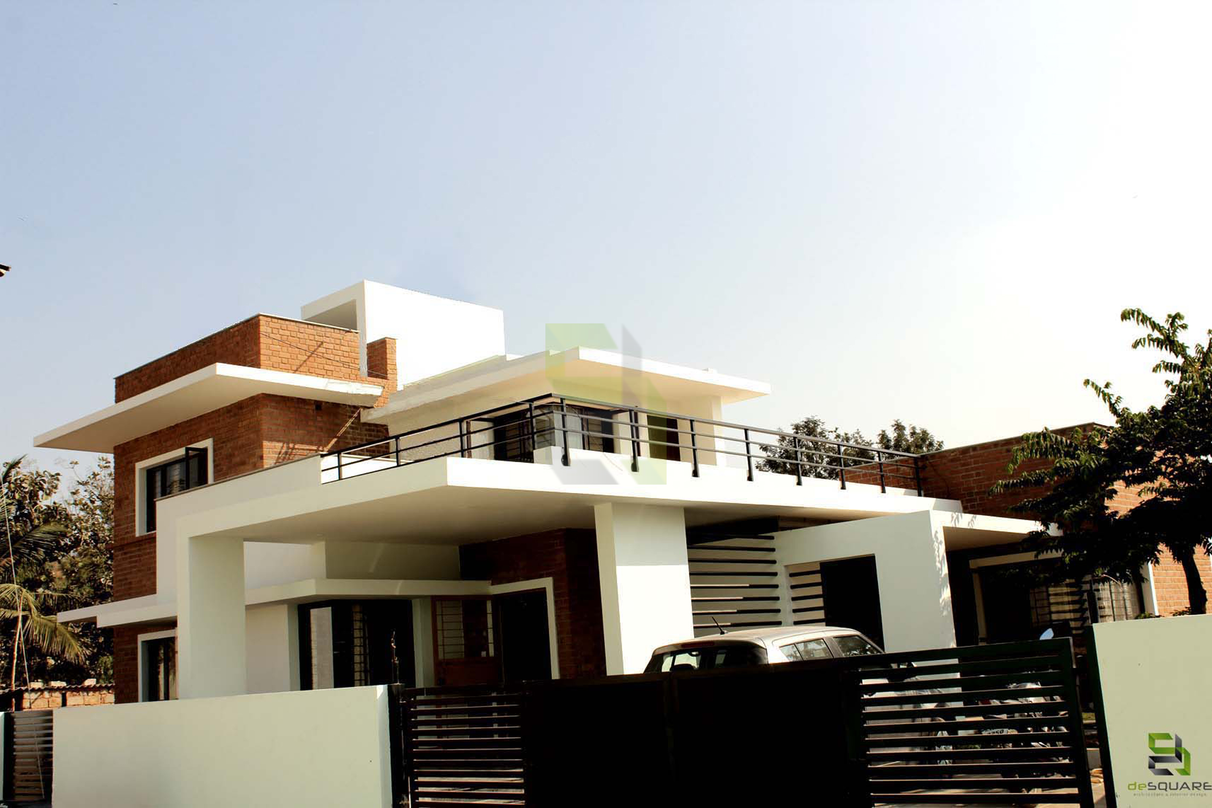 Located on the side of a hill, the site is blessed with a view to the valley on the west. The challenge was to get the view and the wind, but avoid the direct sun and rain. This provided an interesting context, which lead to a design with masses arranged at varying heights with large overhangs. The masses are so arranged to provide every space with a view. The large overhangs prevent direct sun allowing in the light and the ventilation. Along with the cantilever slabs and the differences in heights, the masses are so arranged so that, one block looks extruded from another perpendicular to it. Concrete is reduced by making it a load bearing structure, but beams are provided for the slabs to support the long overhangs. The exposed materials give a vernacular tinge to the contemporary styling.