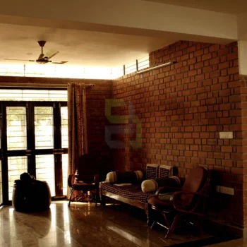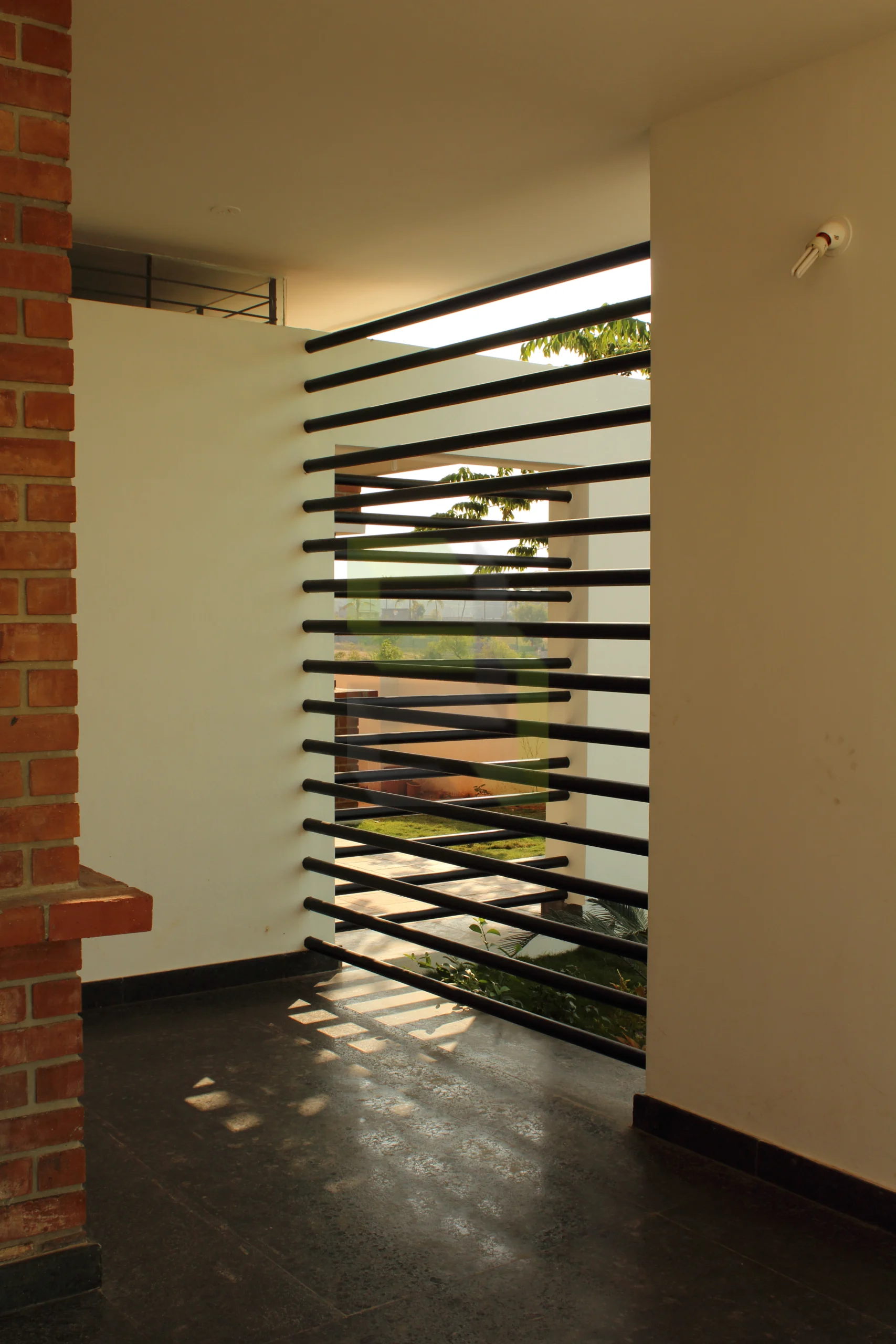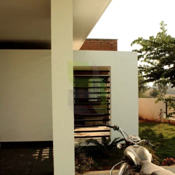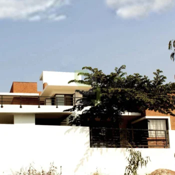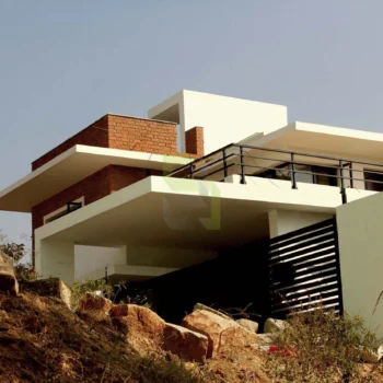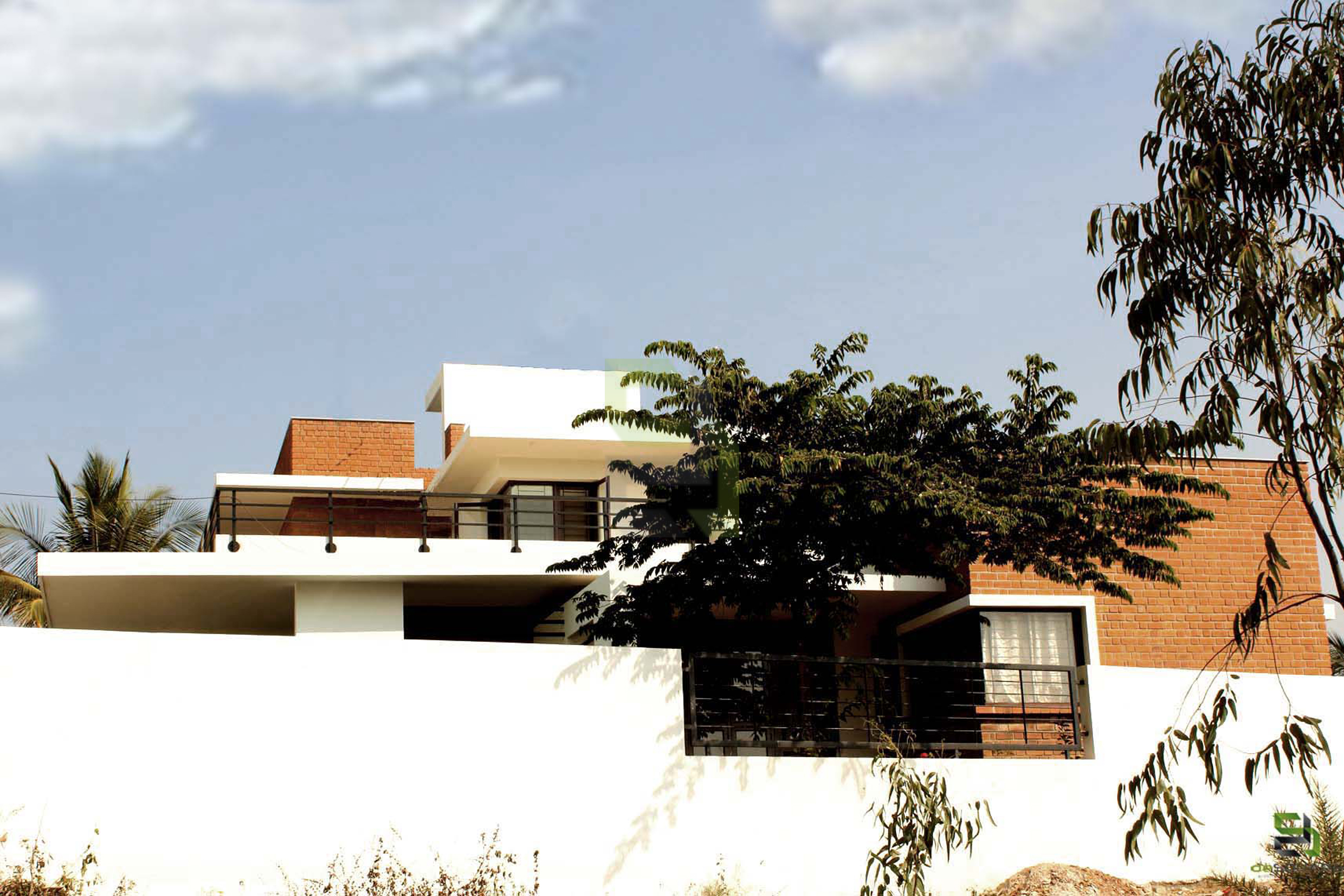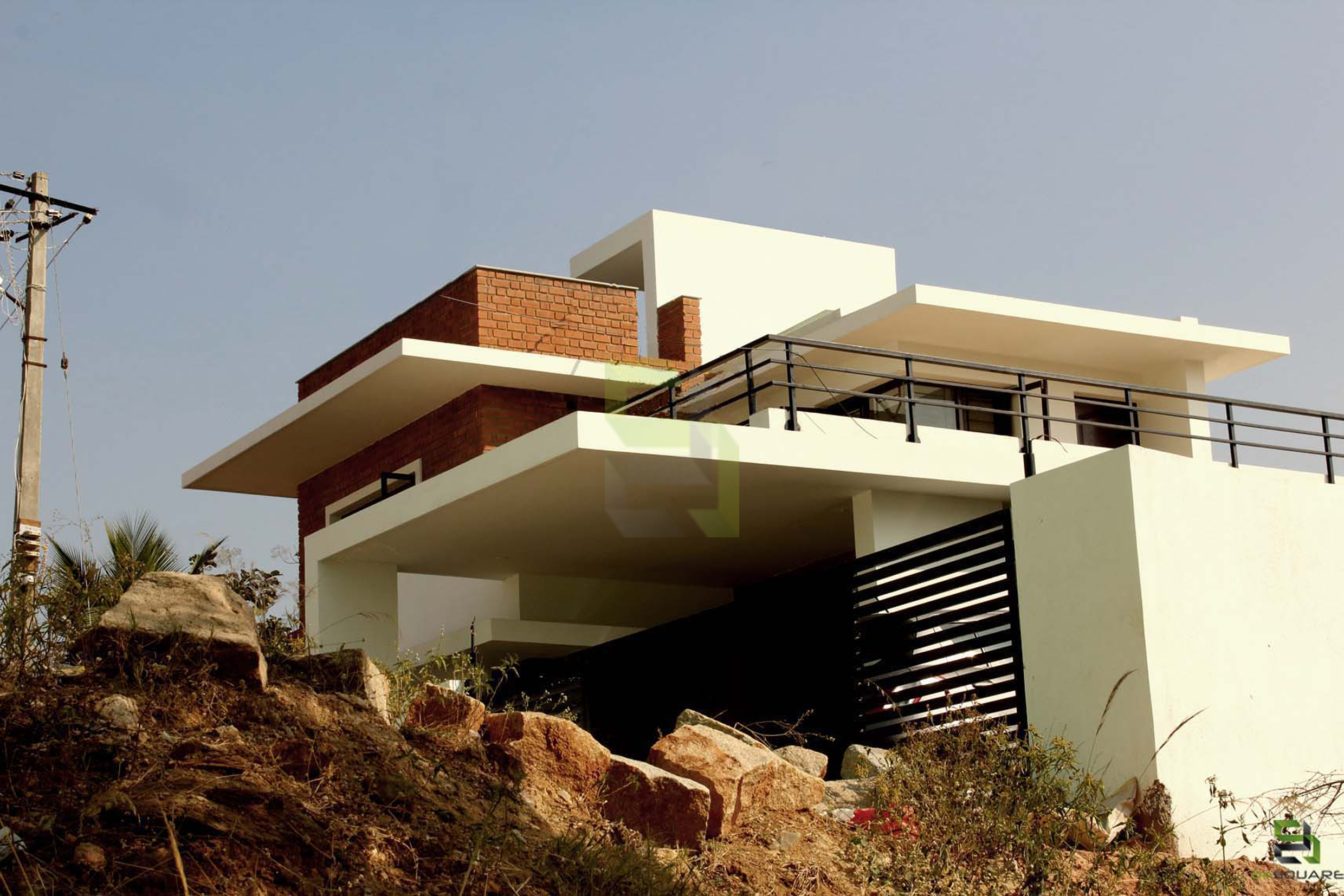 Located on the side of a hill, the site is blessed with a view to the valley on the west. The challenge was to get the view and the wind, but avoid the direct sun and rain. This provided an interesting context, which lead to a design with masses arranged at varying heights with large overhangs. The masses are so arranged to provide every space with a view. The large overhangs prevent direct sun allowing in the light and the ventilation. Along with the cantilever slabs and the differences in heights, the masses are so arranged so that, one block looks extruded from another perpendicular to it. Concrete is reduced by making it a load bearing structure, but beams are provided for the slabs to support the long overhangs. The exposed materials give a vernacular tinge to the contemporary styling.