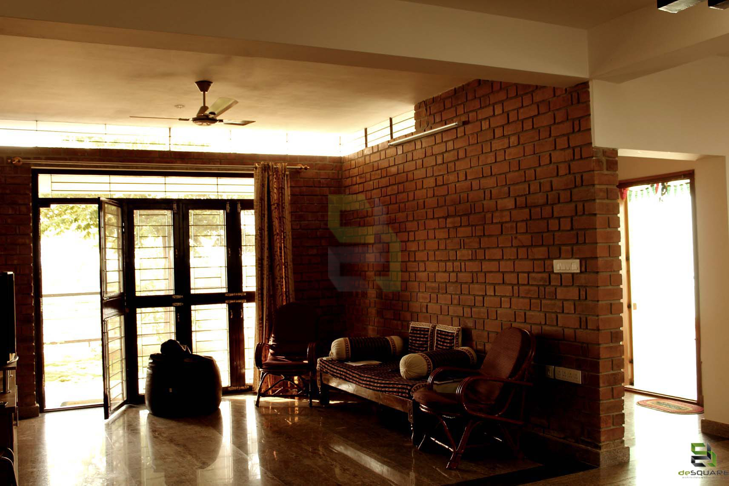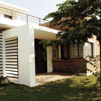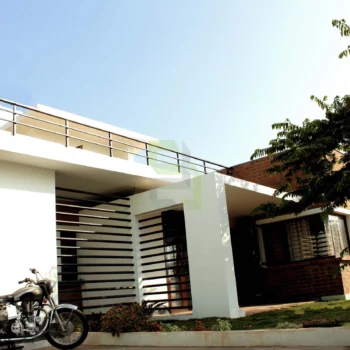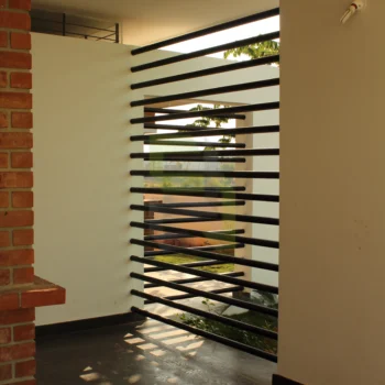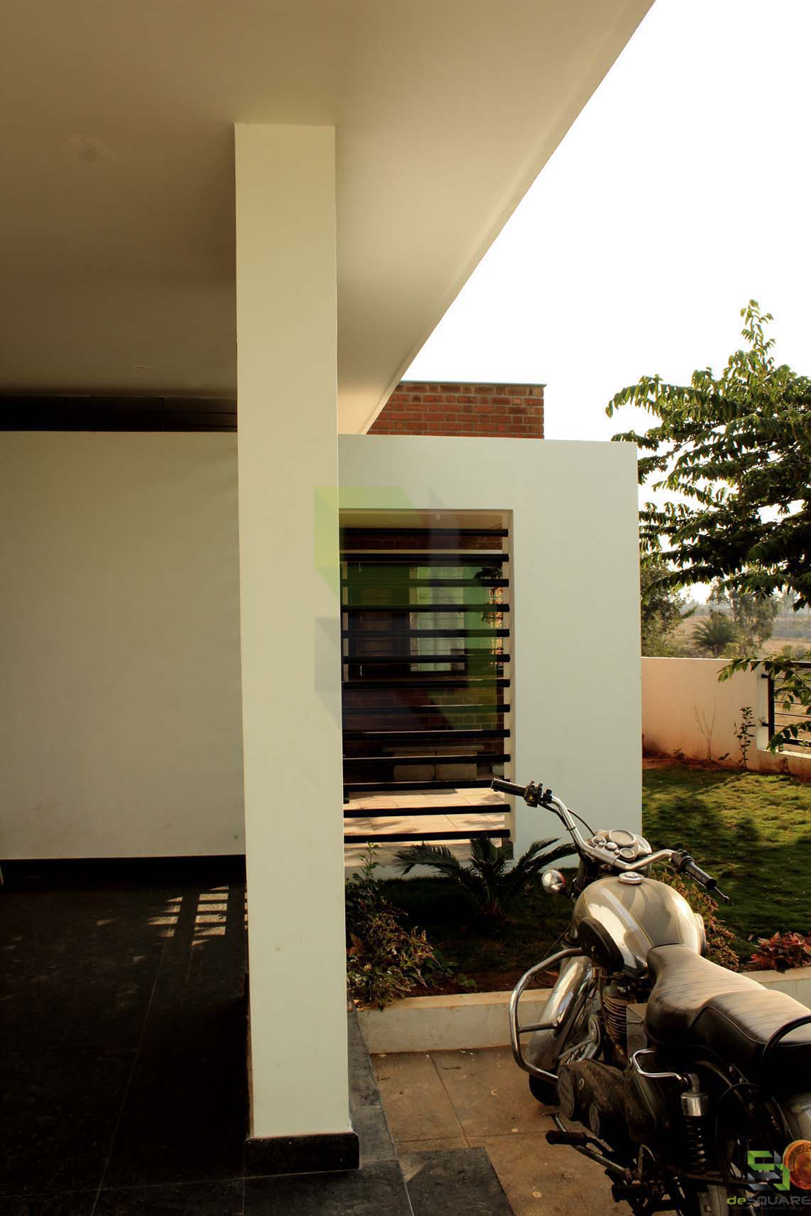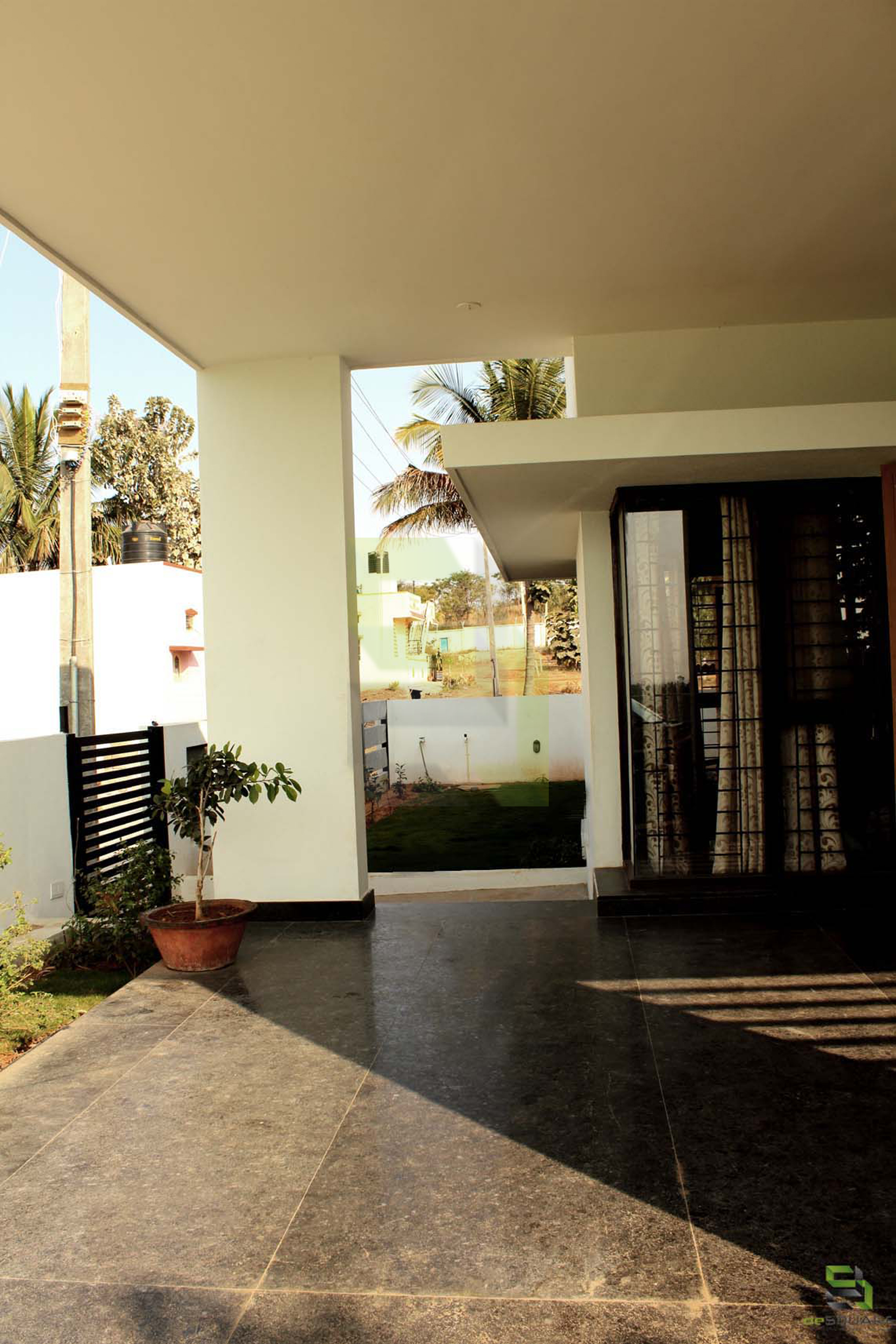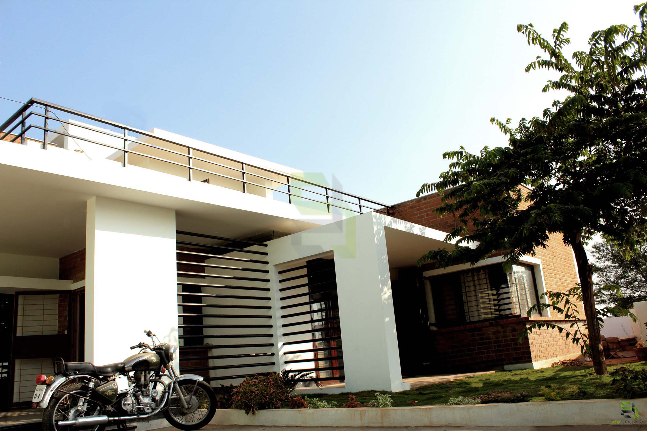 Located on the side of a hill, the site is blessed with a view to the valley on the west. The challenge was to get the view and the wind, but avoid the direct sun and rain. This provided an interesting context, which lead to a design with masses arranged at varying heights with large overhangs. The masses are so arranged to provide every space with a view. The large overhangs prevent direct sun allowing in the light and the ventilation. Along with the cantilever slabs and the differences in heights, the masses are so arranged so that, one block looks extruded from another perpendicular to it. Concrete is reduced by making it a load bearing structure, but beams are provided for the slabs to support the long overhangs. The exposed materials give a vernacular tinge to the contemporary styling.