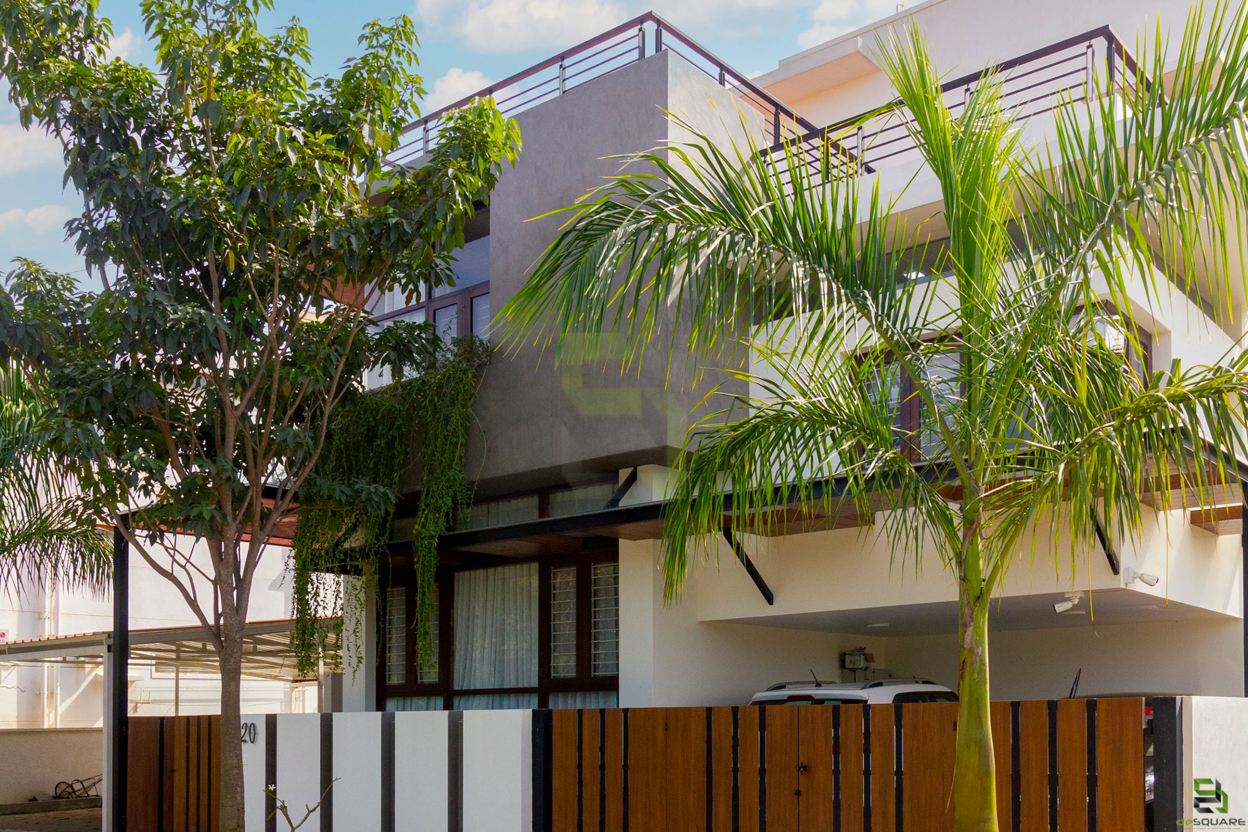 The modern house is situated on a 40ft by 60ft plot and embraces a design that maximizes open spaces while minimizing the use of walls, creating a sense of openness and connection with the surroundings. The dining area is thoughtfully positioned to open up into a garden. There is a centrally located a courtyard with a skylight on the other side of the dining area. This courtyard brings in ample natural light and serves as a tranquil space within the house, adding a touch of serenity and visual interest. It incorporates the concept of a floating Puja, positioned horizontally with windows above and below that gives a floating effect, to create a distinct and visually striking element within the house. The house also includes a car park with a mezzanine space above it. This arrangement optimizes the use of space while maintaining functionality and practicality. The mezzanine space can serve as a home office. The elevation of the house is modern with a combination of white walls and exposed cement finish. This contrast creates a visually appealing facade, adding depth and texture to the overall design. These cement and white finished walls are juxtaposed by horizontal overhangs of metal and wood finish to give a complete modern design.