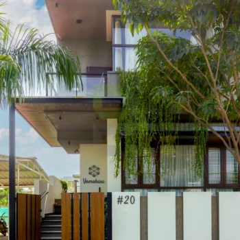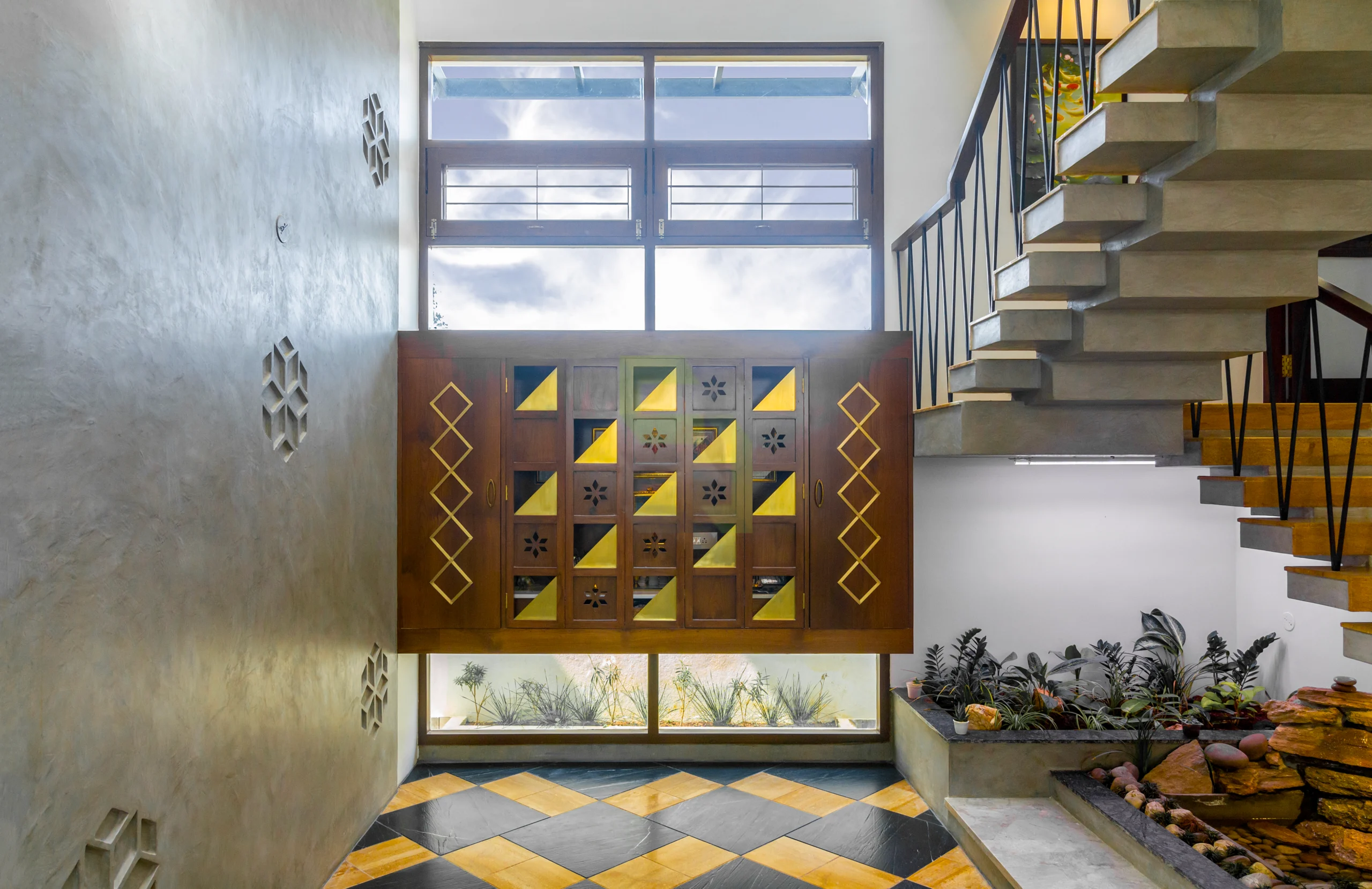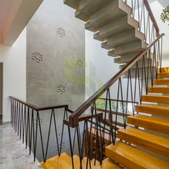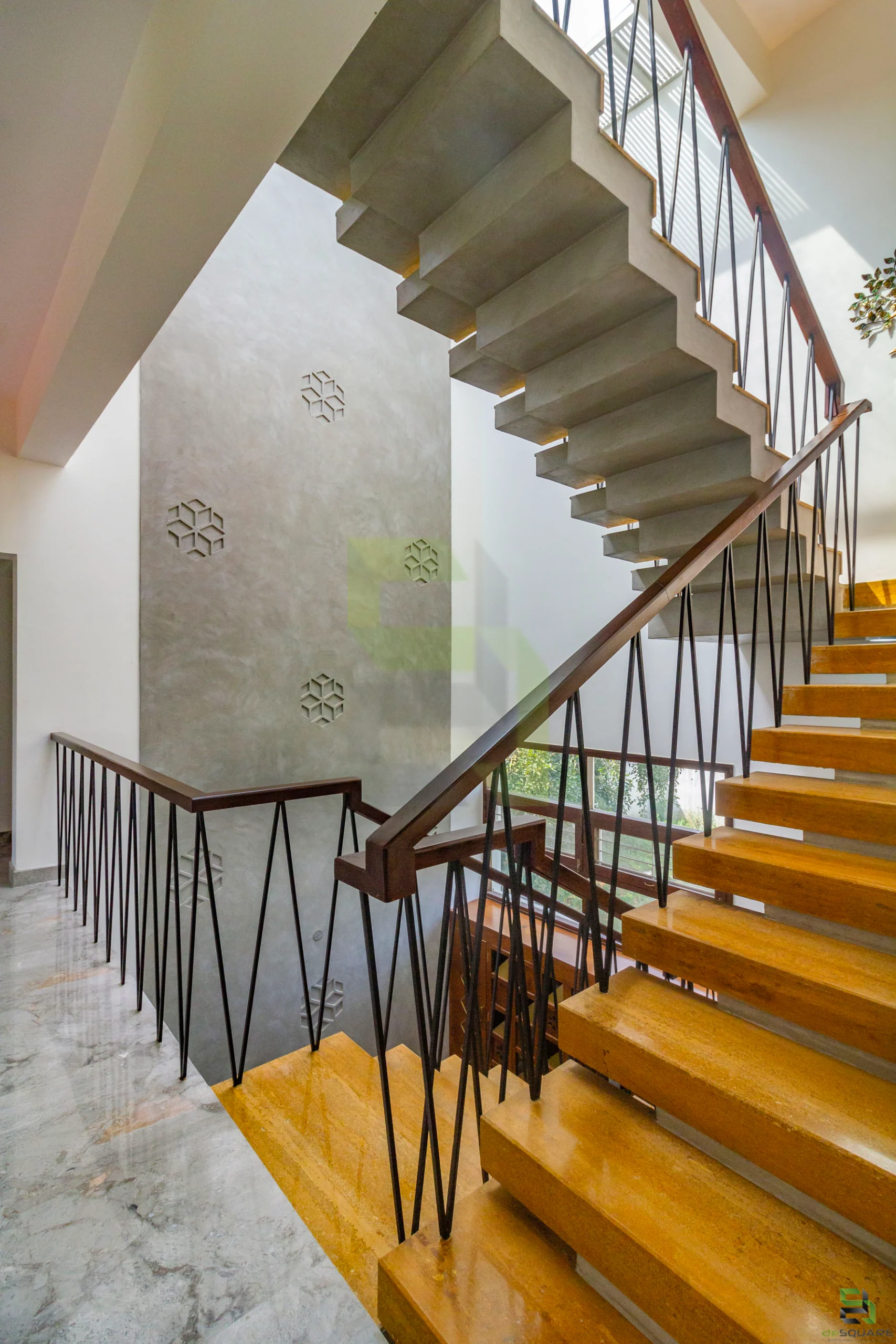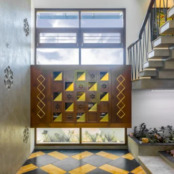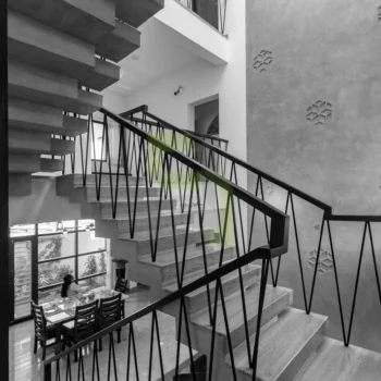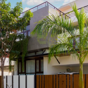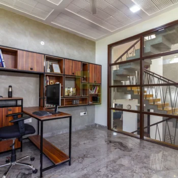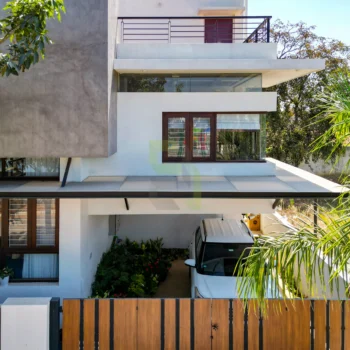 The modern house is situated on a 40ft by 60ft plot and embraces a design that maximizes open spaces while minimizing the use of walls, creating a sense of openness and connection with the surroundings. The dining area is thoughtfully positioned to open up into a garden. There is a centrally located a courtyard with a skylight on the other side of the dining area. This courtyard brings in ample natural light and serves as a tranquil space within the house, adding a touch of serenity and visual interest. It incorporates the concept of a floating Puja, positioned horizontally with windows above and below that gives a floating effect, to create a distinct and visually striking element within the house. The house also includes a car park with a mezzanine space above it. This arrangement optimizes the use of space while maintaining functionality and practicality. The mezzanine space can serve as a home office. The elevation of the house is modern with a combination of white walls and exposed cement finish. This contrast creates a visually appealing facade, adding depth and texture to the overall design. These cement and white finished walls are juxtaposed by horizontal overhangs of metal and wood finish to give a complete modern design.