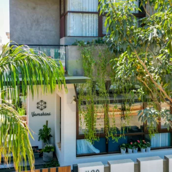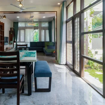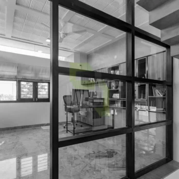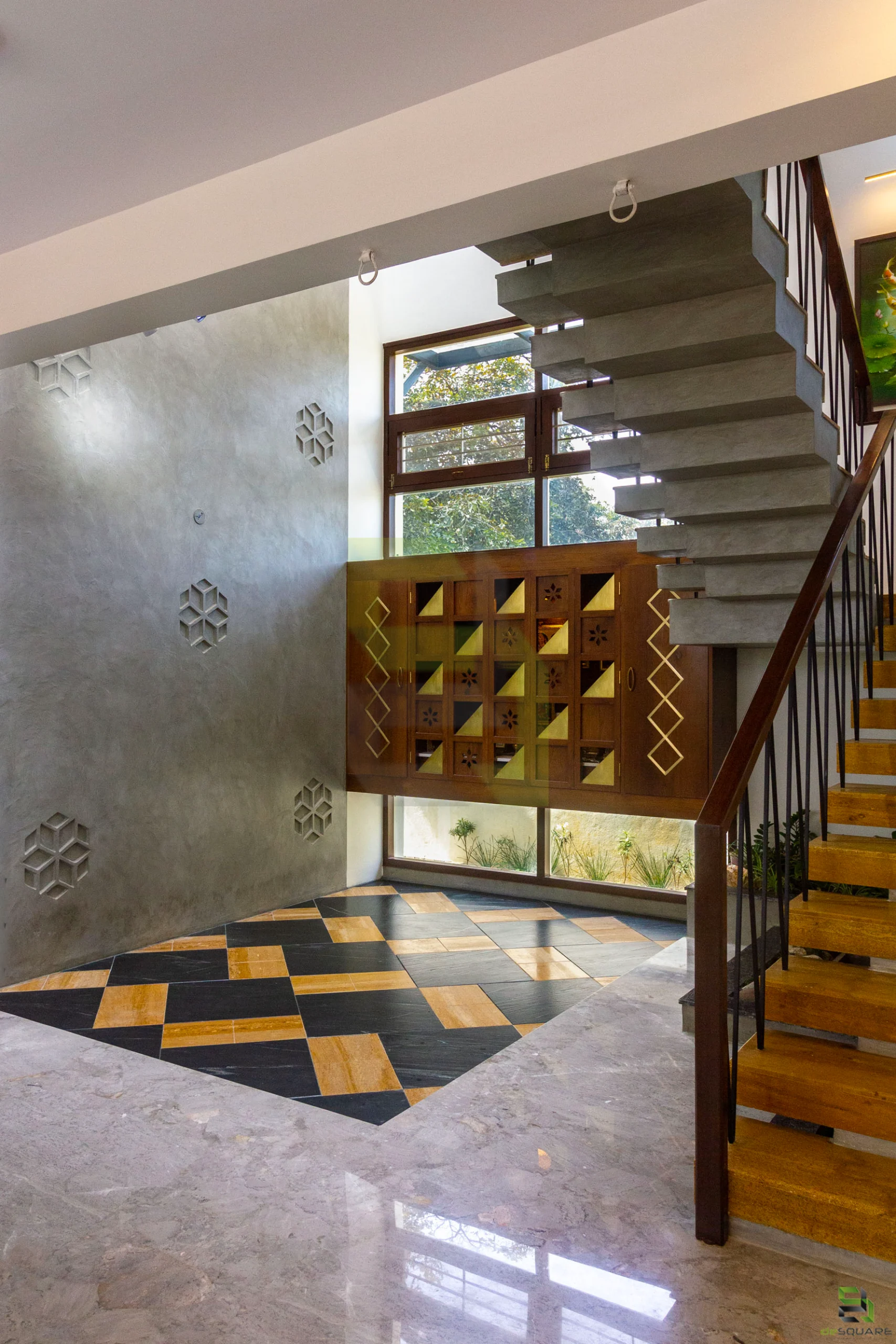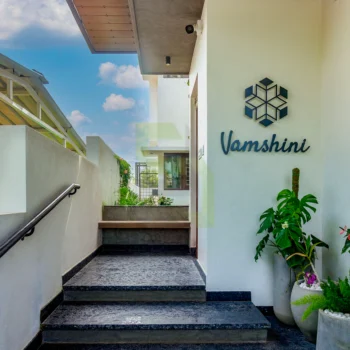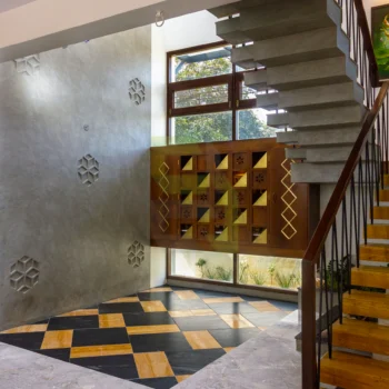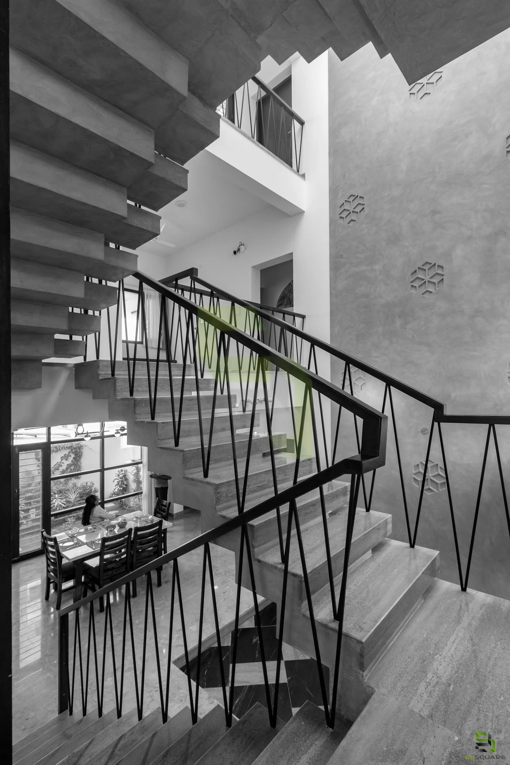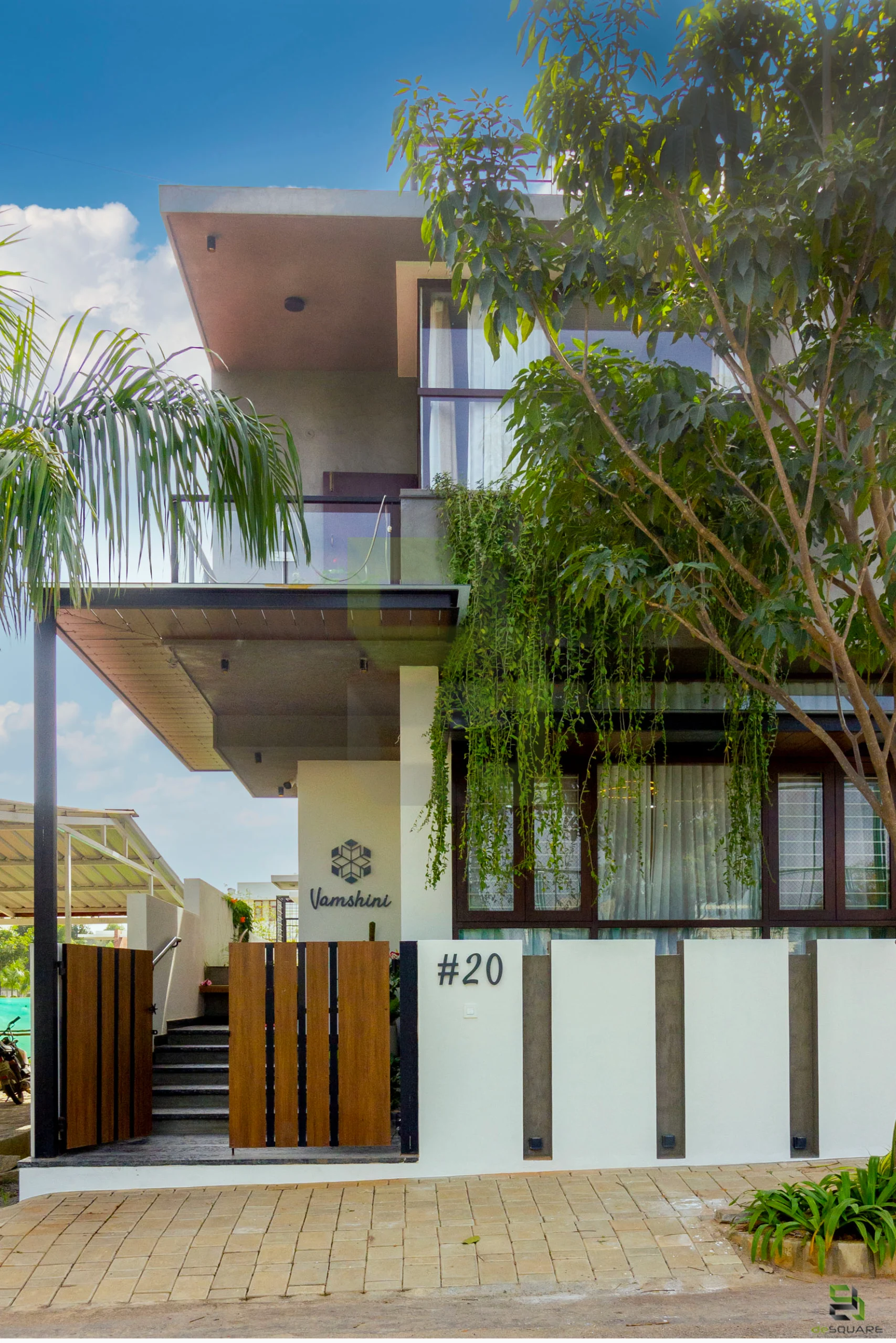 The modern house is situated on a 40ft by 60ft plot and embraces a design that maximizes open spaces while minimizing the use of walls, creating a sense of openness and connection with the surroundings. The dining area is thoughtfully positioned to open up into a garden. There is a centrally located a courtyard with a skylight on the other side of the dining area. This courtyard brings in ample natural light and serves as a tranquil space within the house, adding a touch of serenity and visual interest. It incorporates the concept of a floating Puja, positioned horizontally with windows above and below that gives a floating effect, to create a distinct and visually striking element within the house. The house also includes a car park with a mezzanine space above it. This arrangement optimizes the use of space while maintaining functionality and practicality. The mezzanine space can serve as a home office. The elevation of the house is modern with a combination of white walls and exposed cement finish. This contrast creates a visually appealing facade, adding depth and texture to the overall design. These cement and white finished walls are juxtaposed by horizontal overhangs of metal and wood finish to give a complete modern design.