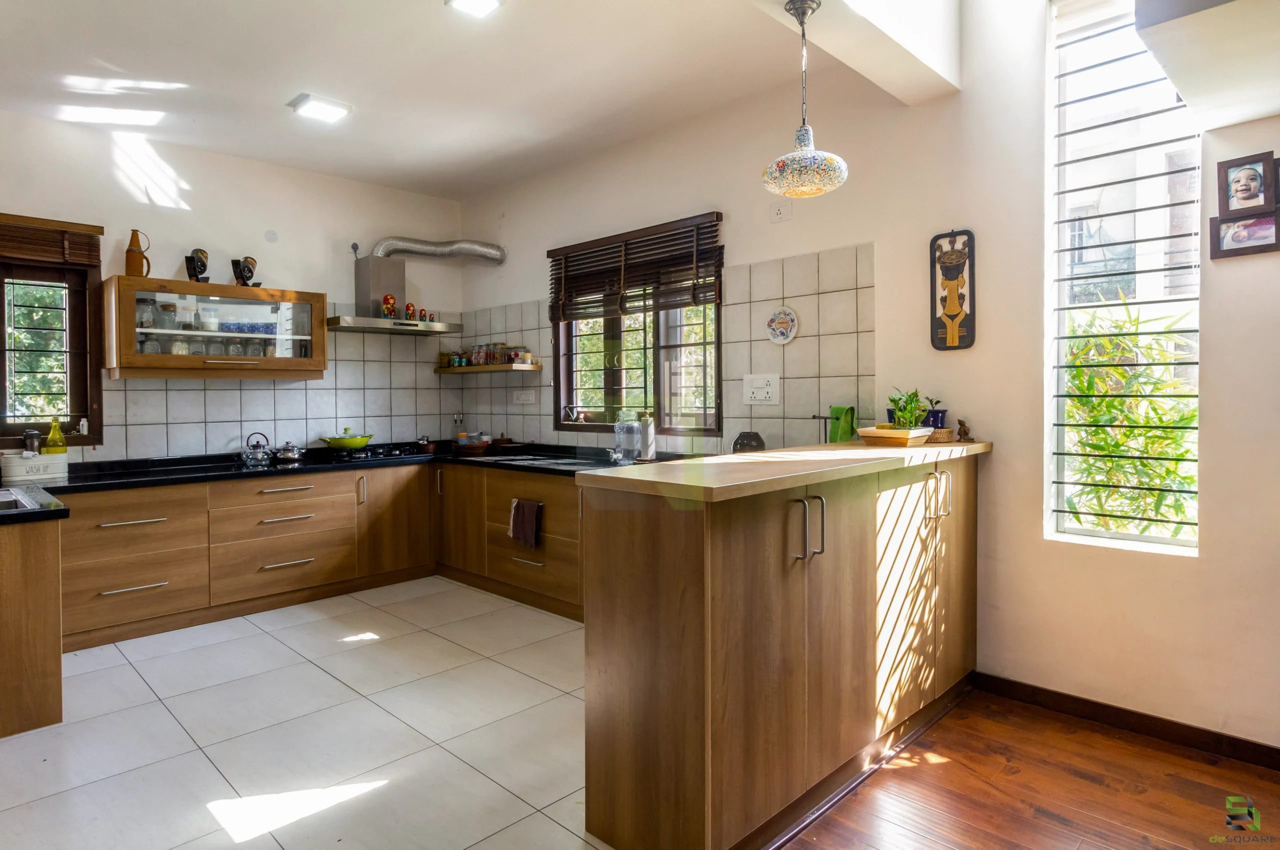 The clients’ requirement was an economical solution for a spacious and well-lit house. The site was 60’*40’ in dimension in the suburbs of Bangalore. The design was done in an “L- shape” with a garden occupying the void of the “L” in the northwest corner. Its an open plan design with no internal walls except for the bedrooms and the toilets. In the elevation one can see a large cantilever slab, which was a resultant of avoiding pillars in the carpark, made to look as a horizontal member cutting through the vertical mass on the left. To give vernacular touch to the modern elevation, cleanly dressed laterite stones were used against grey shades of the walls.