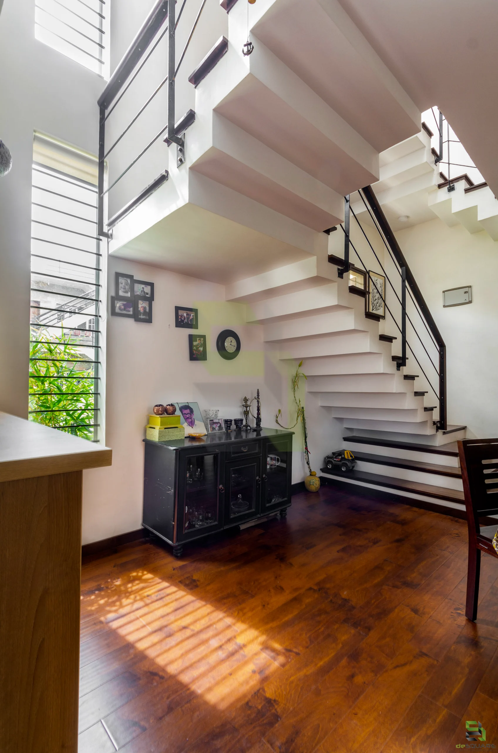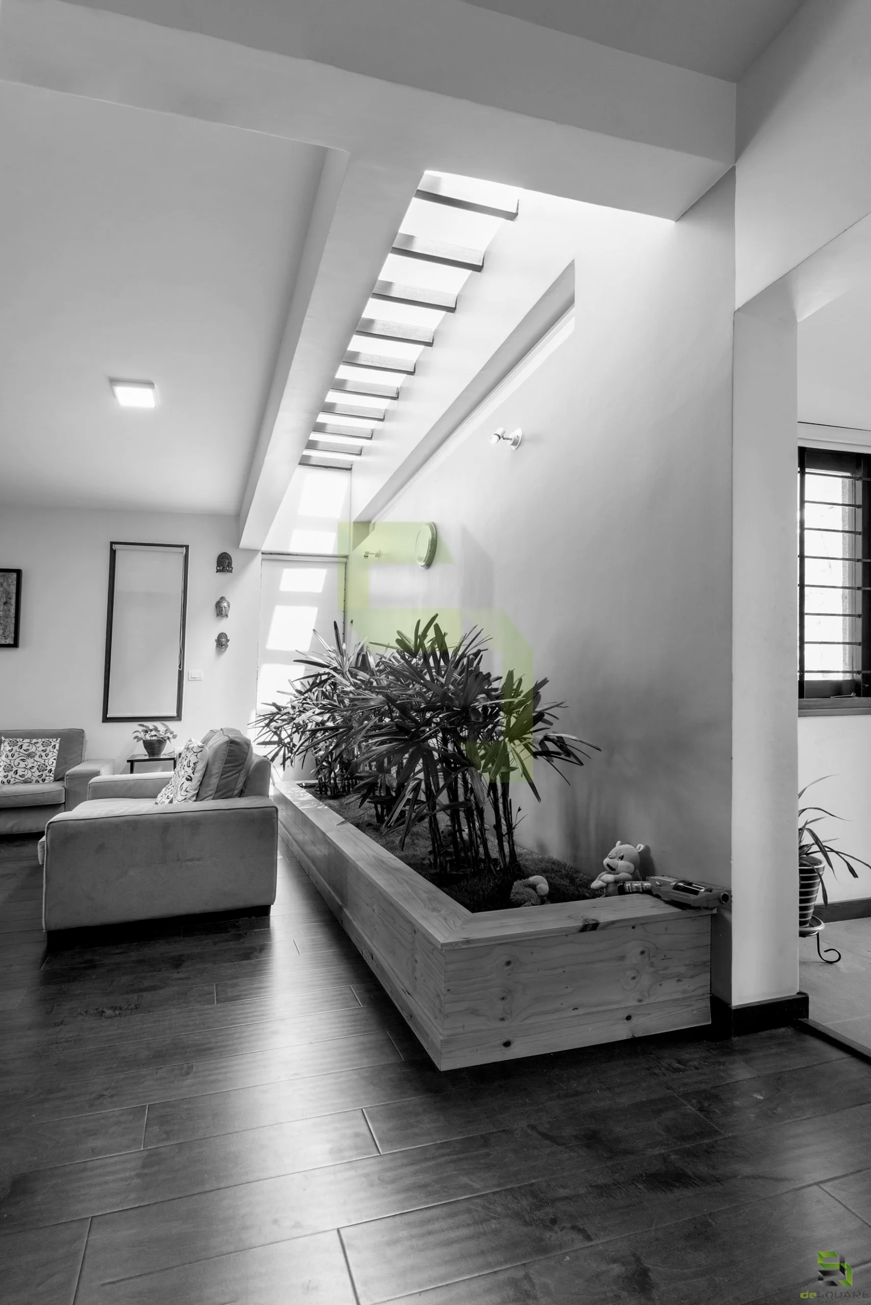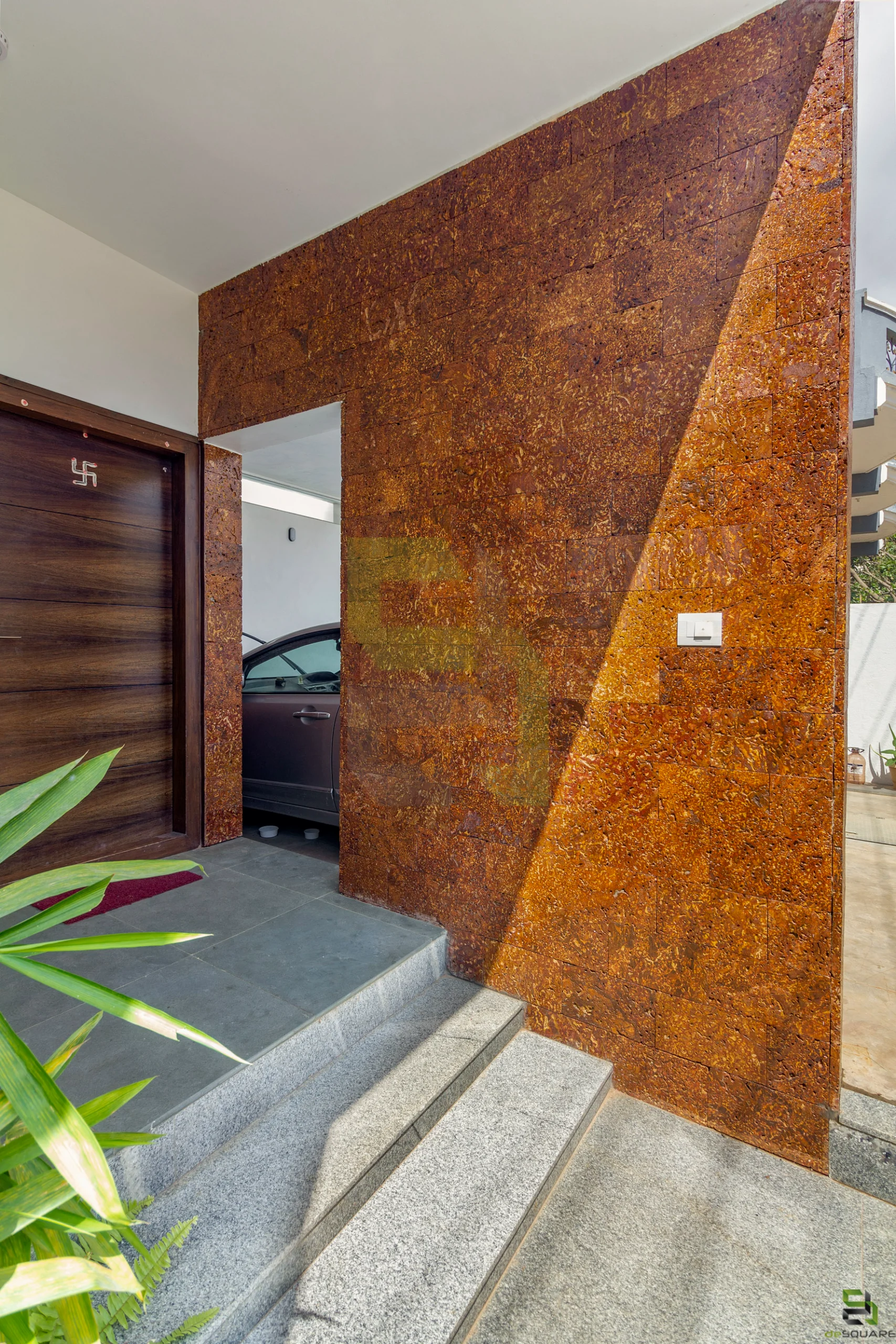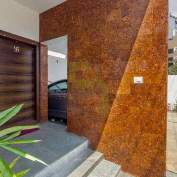 The clients’ requirement was an economical solution for a spacious and well-lit house. The site was 60’*40’ in dimension in the suburbs of Bangalore. The design was done in an “L- shape” with a garden occupying the void of the “L” in the northwest corner. Its an open plan design with no internal walls except for the bedrooms and the toilets. In the elevation one can see a large cantilever slab, which was a resultant of avoiding pillars in the carpark, made to look as a horizontal member cutting through the vertical mass on the left. To give vernacular touch to the modern elevation, cleanly dressed laterite stones were used against grey shades of the walls.