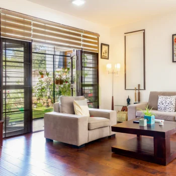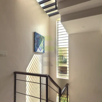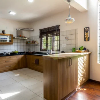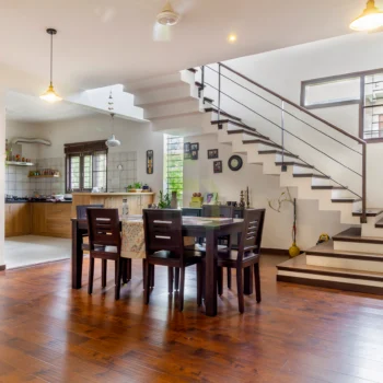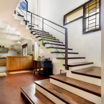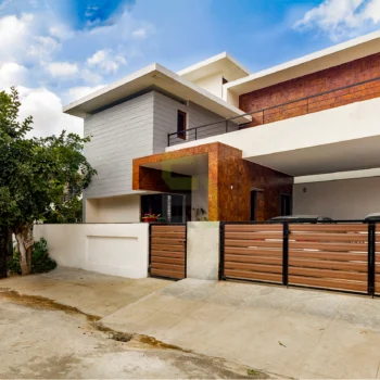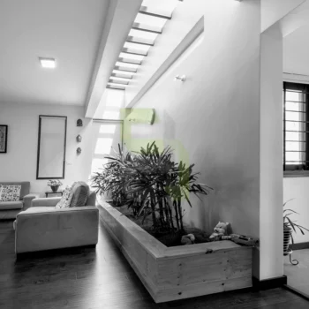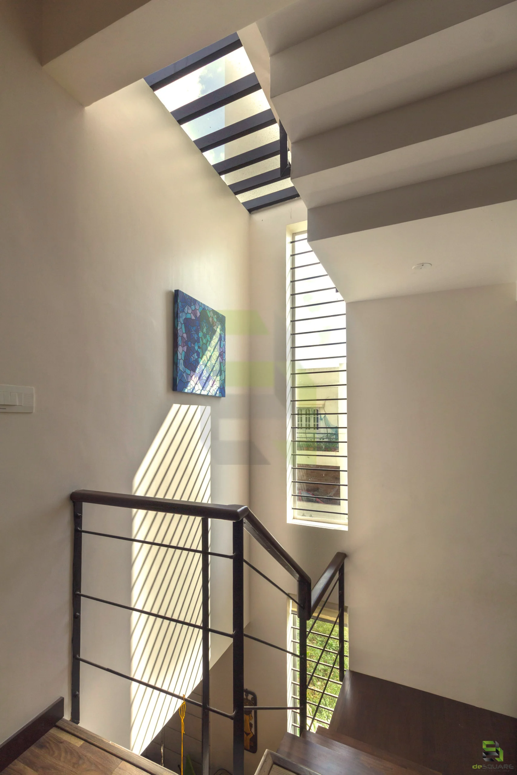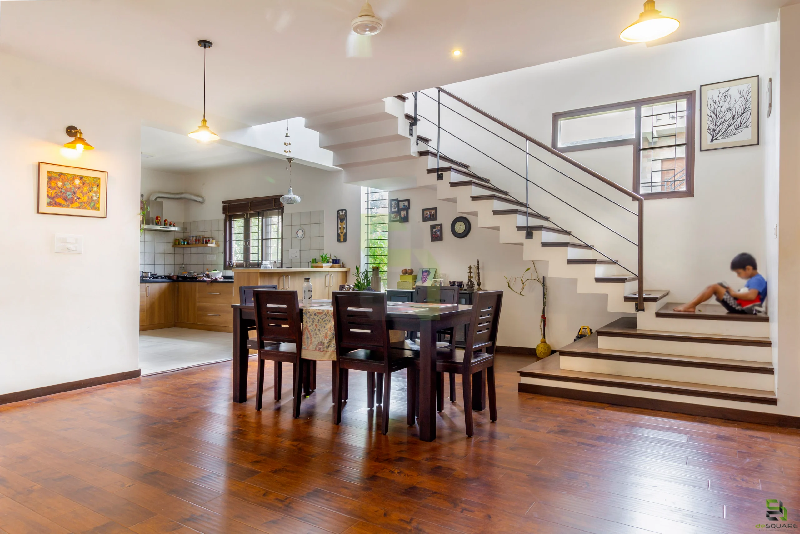 The clients’ requirement was an economical solution for a spacious and well-lit house. The site was 60’*40’ in dimension in the suburbs of Bangalore. The design was done in an “L- shape” with a garden occupying the void of the “L” in the northwest corner. Its an open plan design with no internal walls except for the bedrooms and the toilets. In the elevation one can see a large cantilever slab, which was a resultant of avoiding pillars in the carpark, made to look as a horizontal member cutting through the vertical mass on the left. To give vernacular touch to the modern elevation, cleanly dressed laterite stones were used against grey shades of the walls.